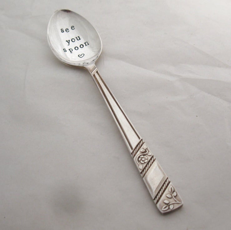 A handstamped vintage silverplated coffee spoon with a flower pattern handle and the wording 'see you spoon' in black lettering in the bowl, along with a tiny heart. It's approximately 13cm long. A nice little letterbox gift for a friend you haven't seen for a while.