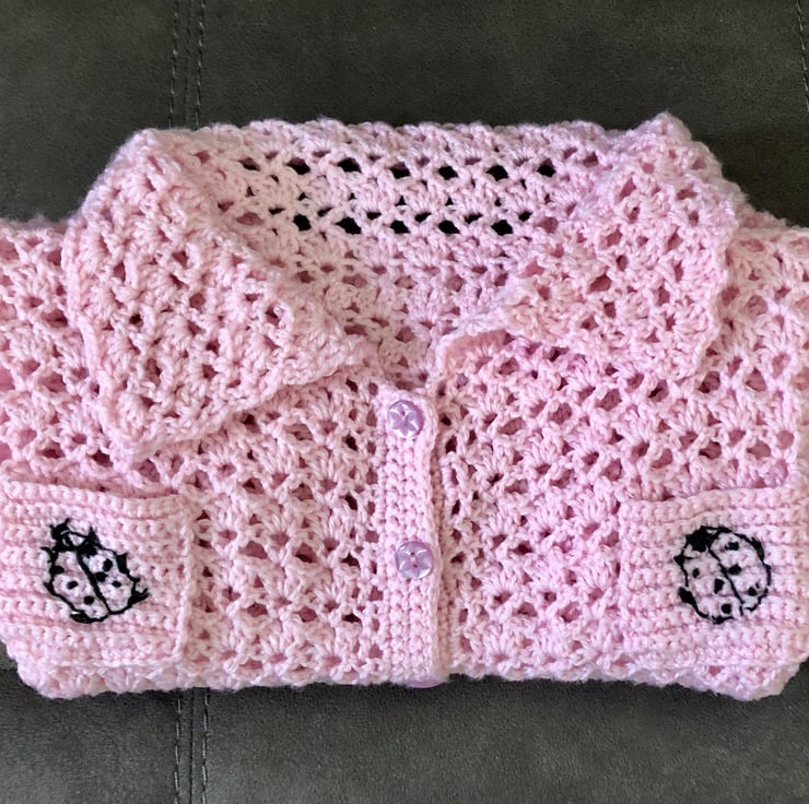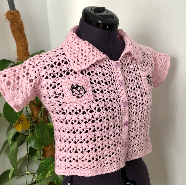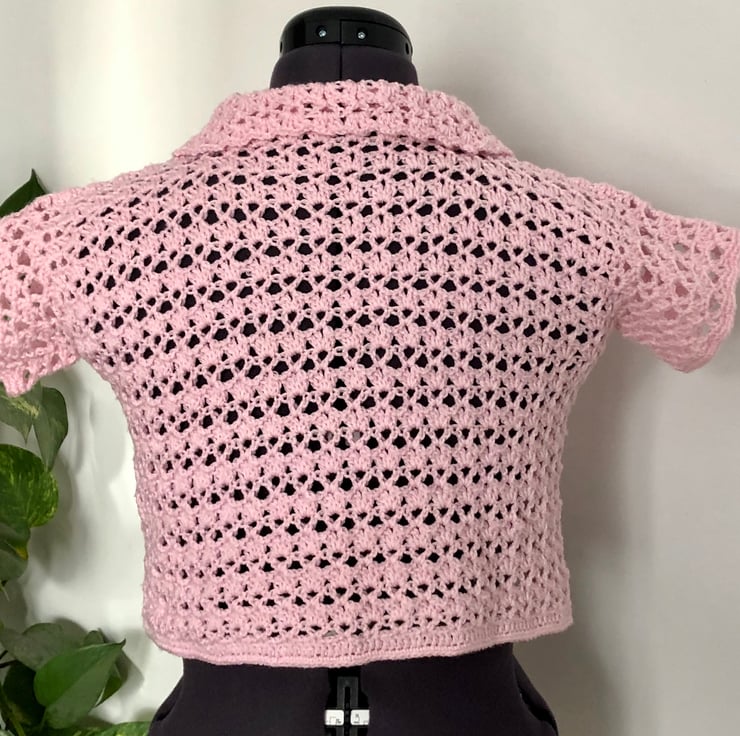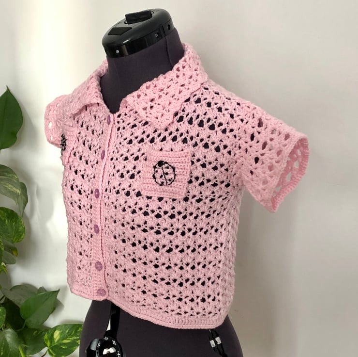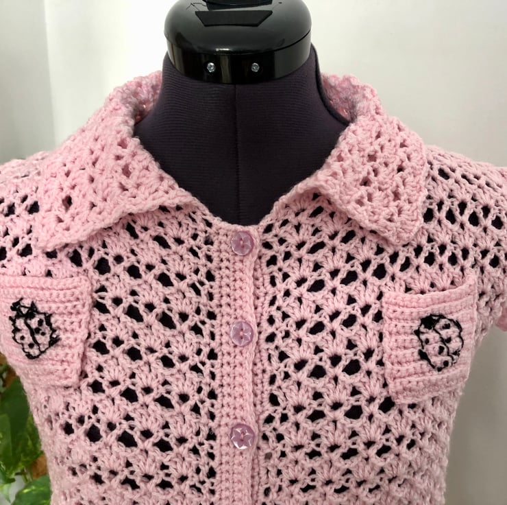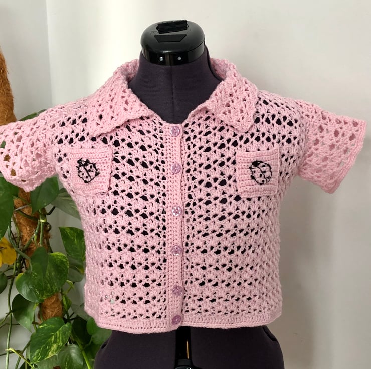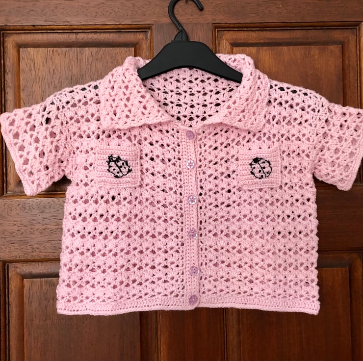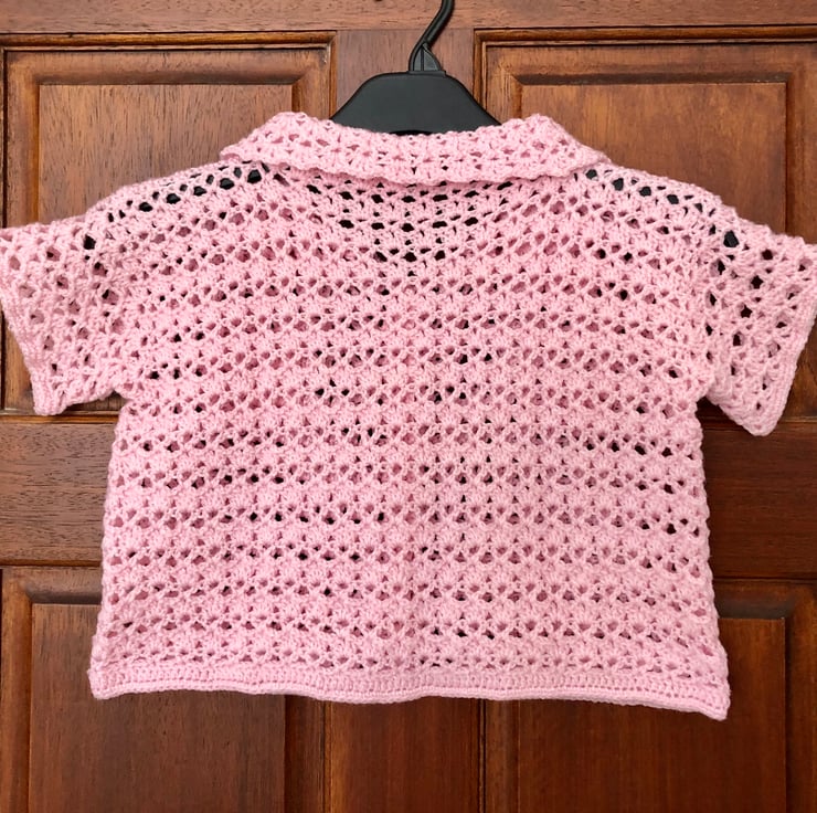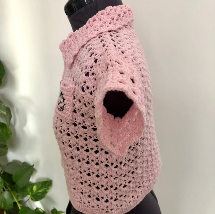 Ladies crochet crop shirt. Short sleeves. Baby pink. Black. Pockets. Size 4.
