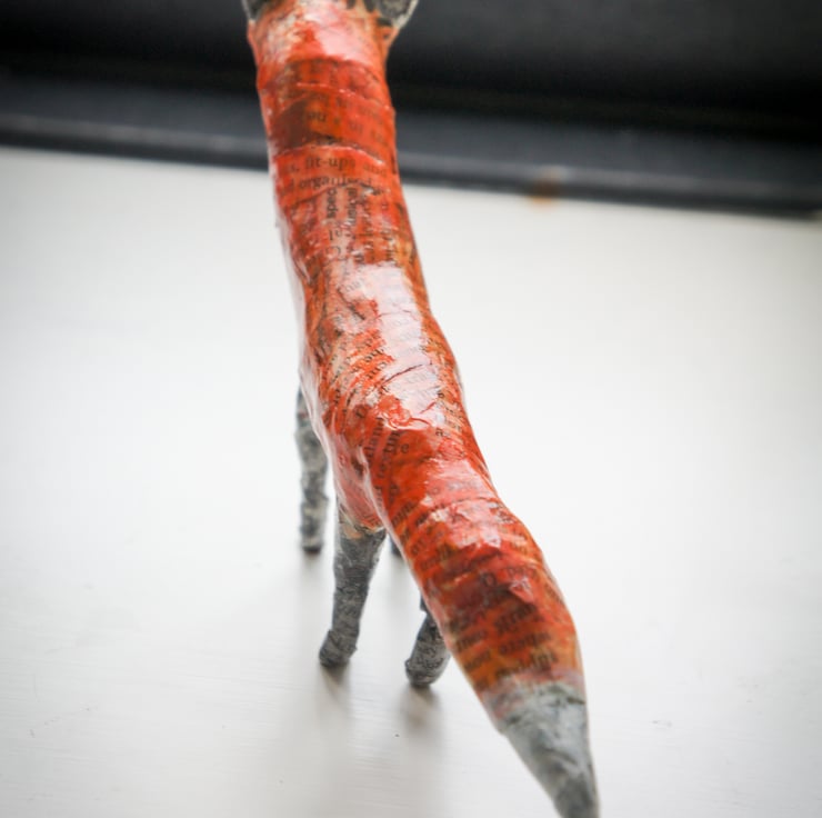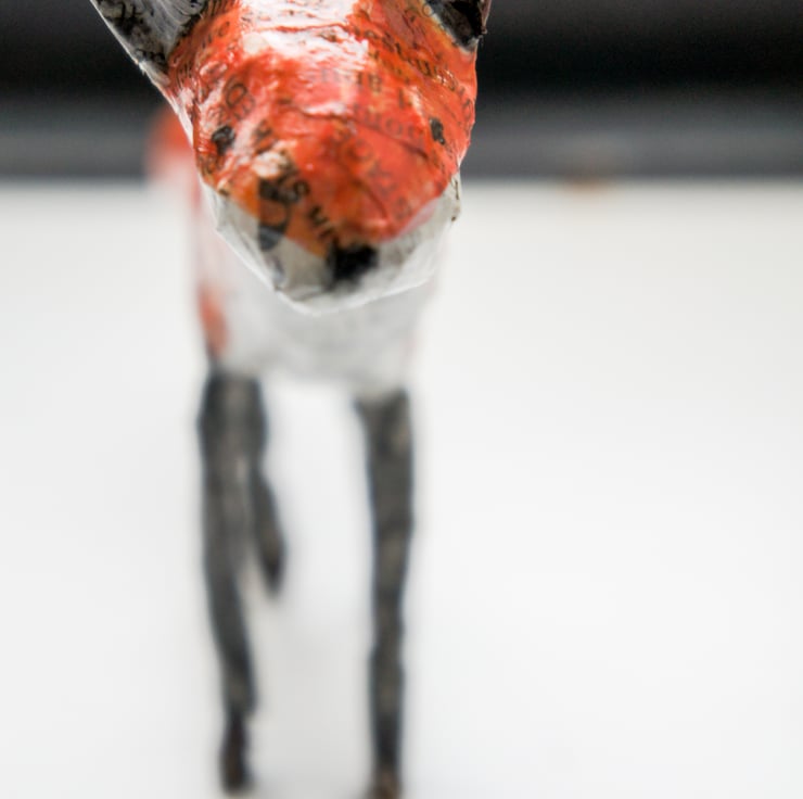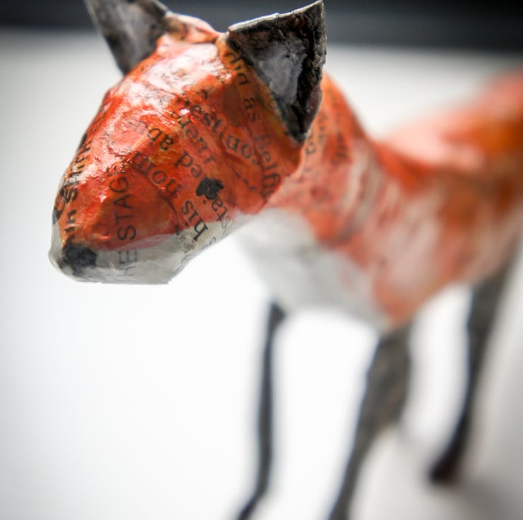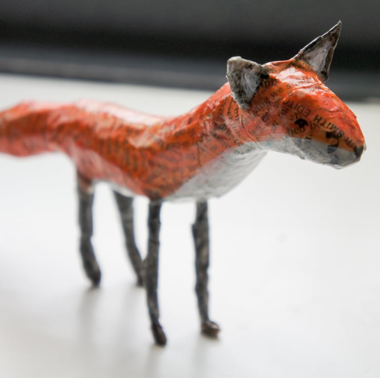 Paper mache fox sculpture. A whimsical little character sculpted from wire, newspaper, homemade glue and painted using acrylic paint. Sealed for protection.