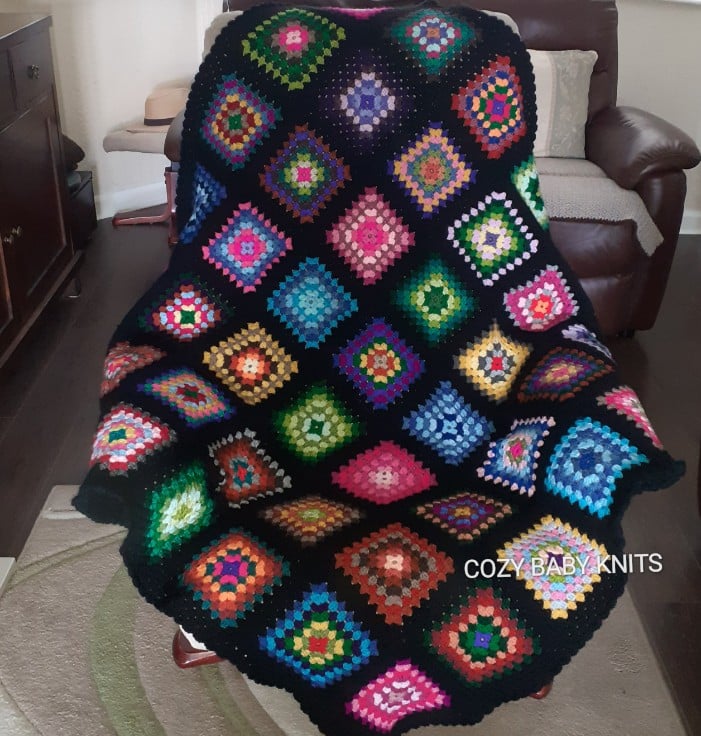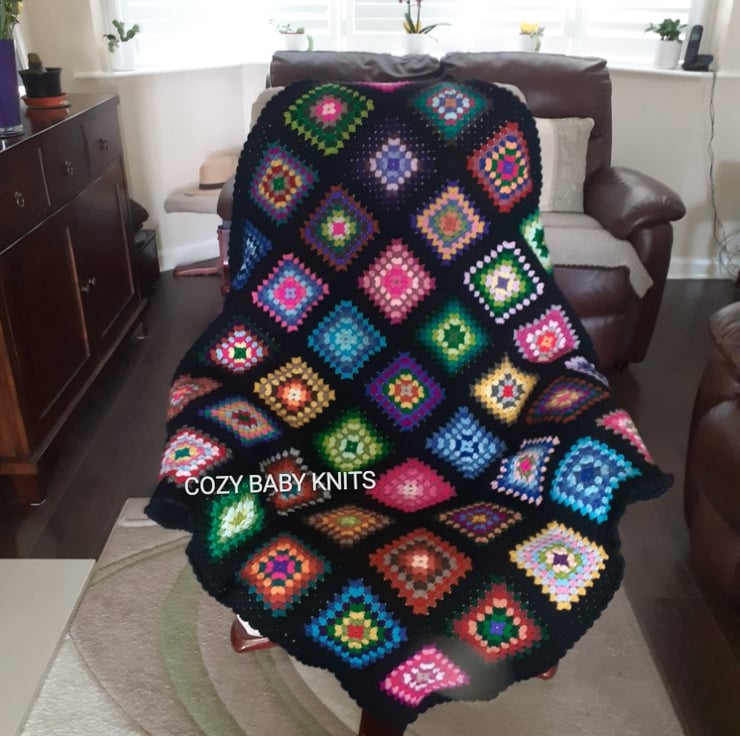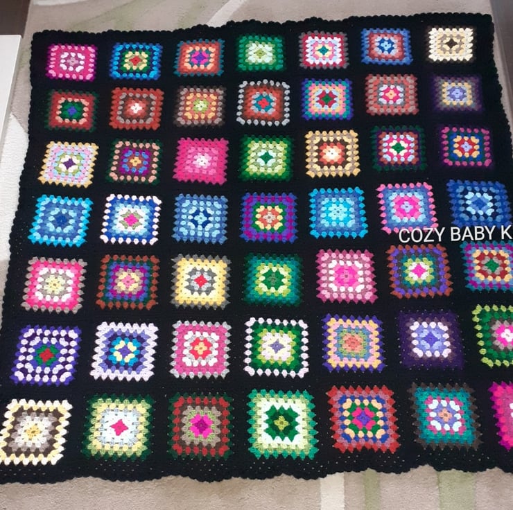 Throw / lap blanket made with 49 granny squares in bright colours with a black border.