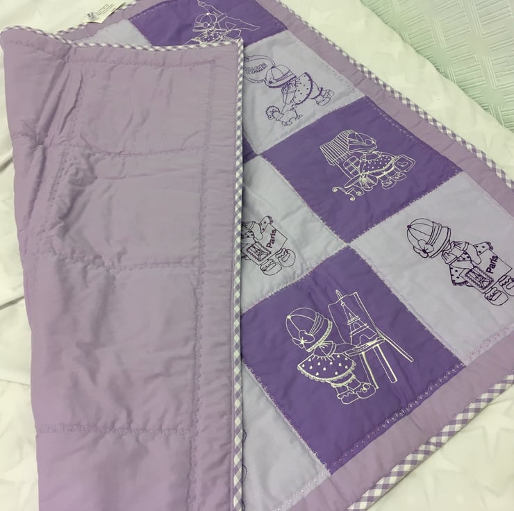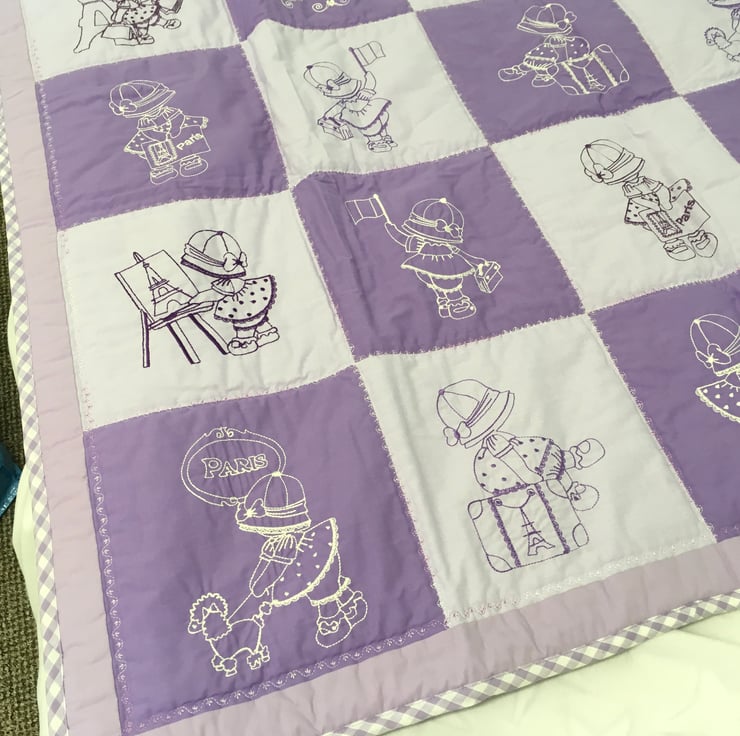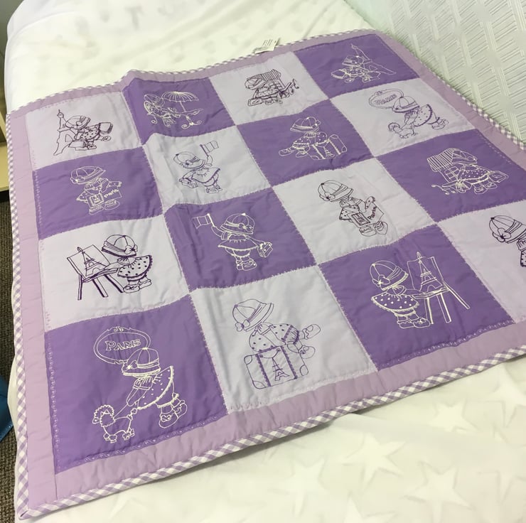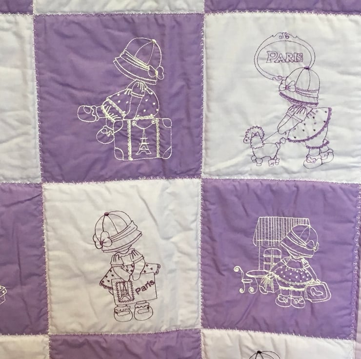 This multi-use quilt in purples, lilac and white shows embroidery designs of Sunbonnet Sue doing a variety of activities in Paris. Ooh la la. Lots to look at when being used as a lap quilt, small bed cover or play mat.