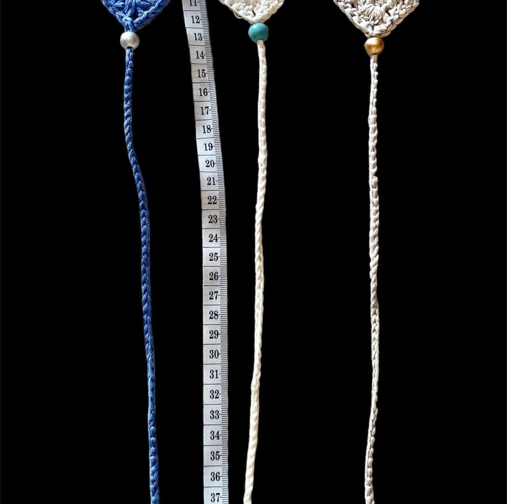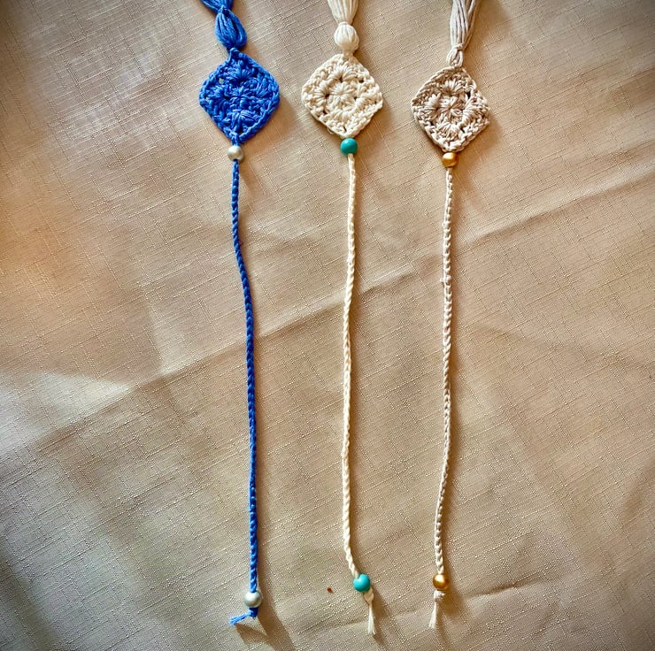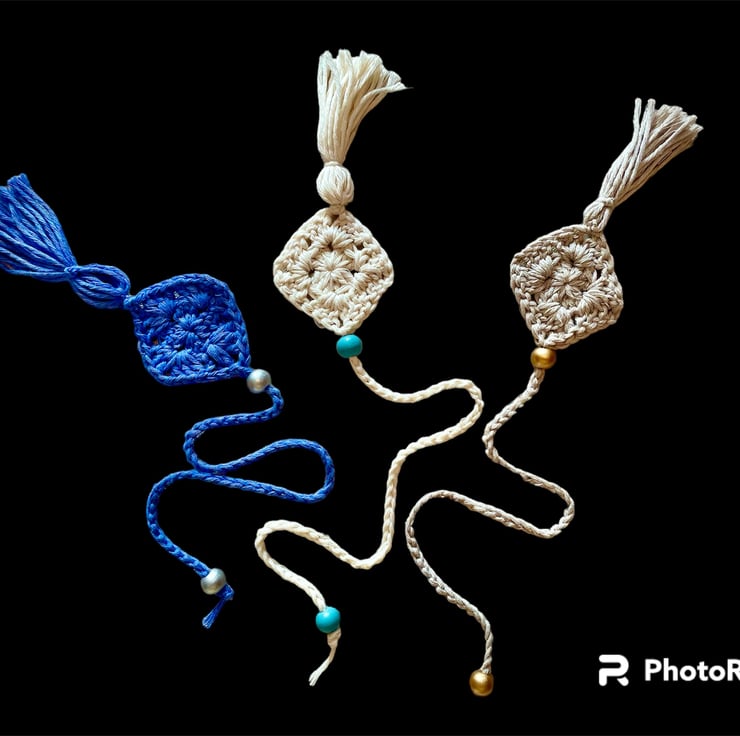 This is a set of 3 Mini- Granny Square Bookmarks made from a cotton blend yarn. Each feature two sliding beads that can be moved up and down he length to meet your bookmarking needs. Each tasselled end crocheted bookmark measures approximately 40 cm in length.