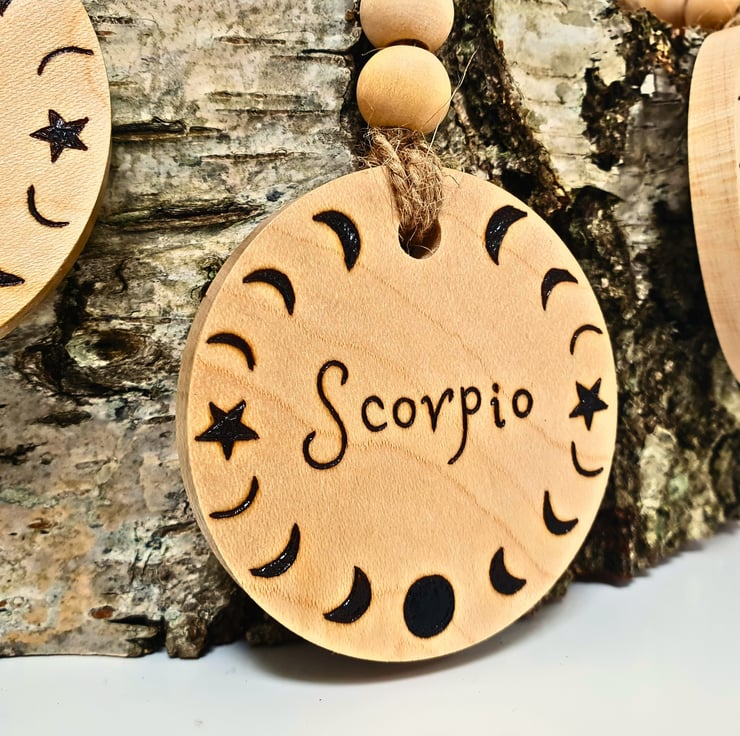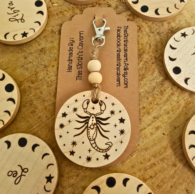 It is round shaped, with a diameter of approximately 6cm (2") and 6mm (1/4 inches thick).It is made from Sycamore wood, light in colour. Both sides are hand drawn with the method of Pyrography (wood burning), one displaying the symbol of the Scorpio zodiac star sign, while the other shows the word "Scorpio" surrounded by the moon phases. It connects with the metallic lobster type hook with natural twine, which is decorated with 2 wooden beads. The keyring is approx. 12.5cm long in total.