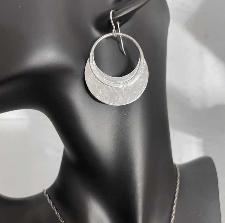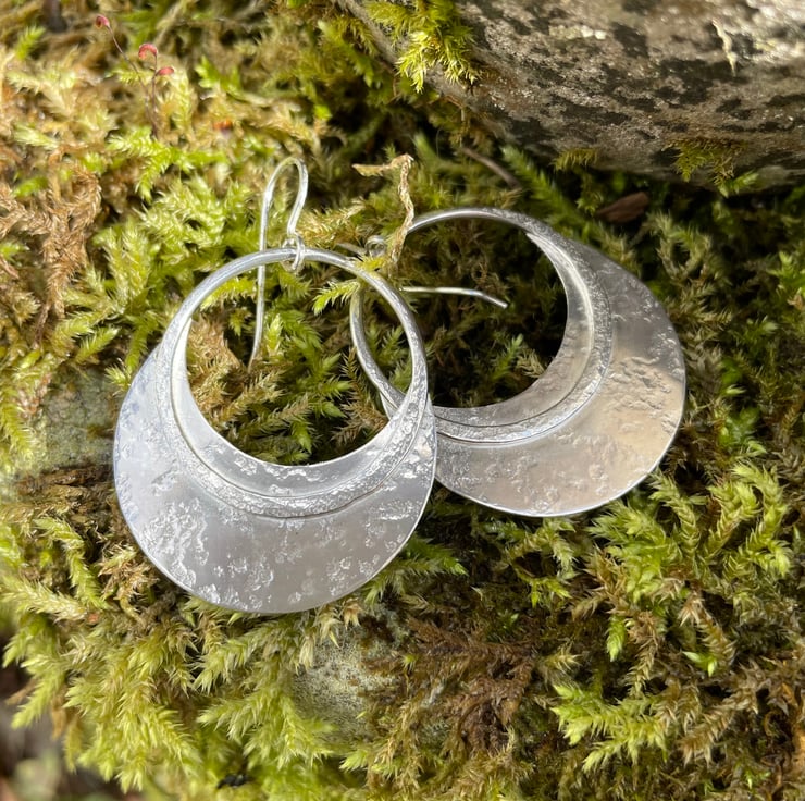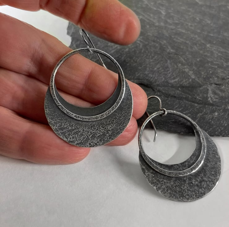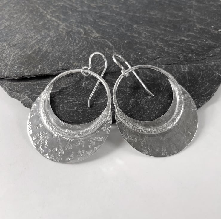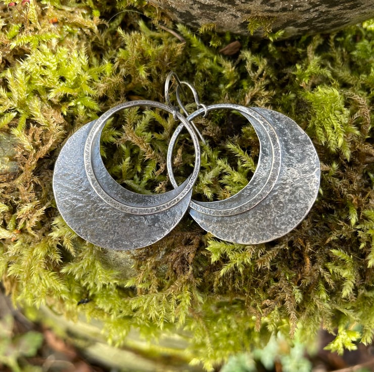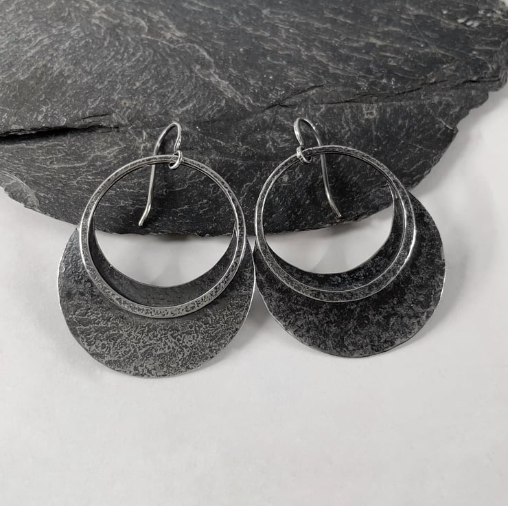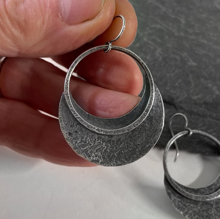 The silver discs and rings are textured with a hammer, you can have them with a bright or oxidised finish. Choose your finish at checkout .