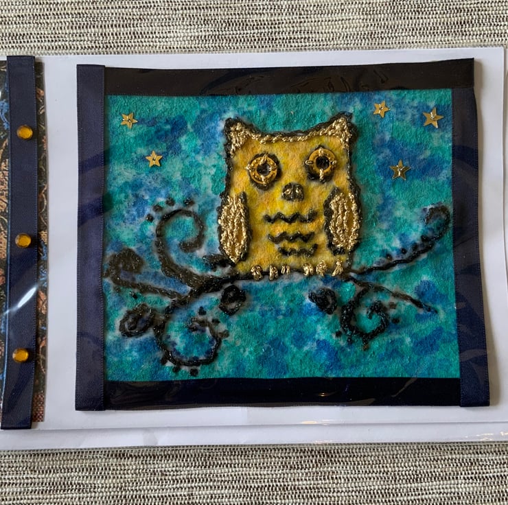 Hand embroidered on a painted blue sky felt backdrop with mini star embelishments. Framed with navy saton ribbon and decorative side boarder,