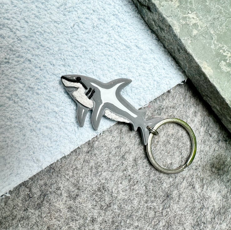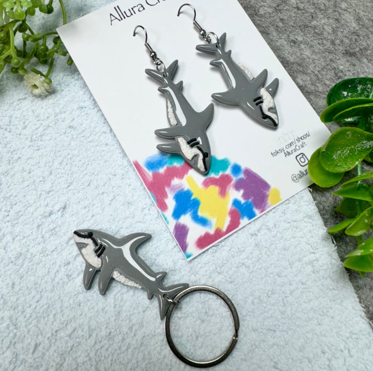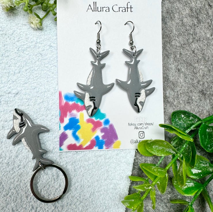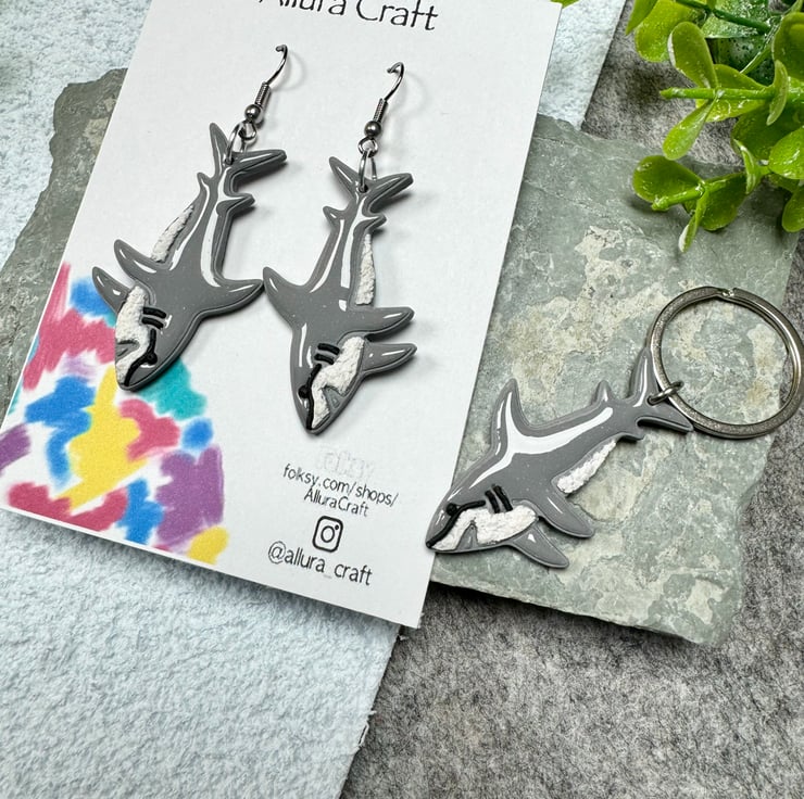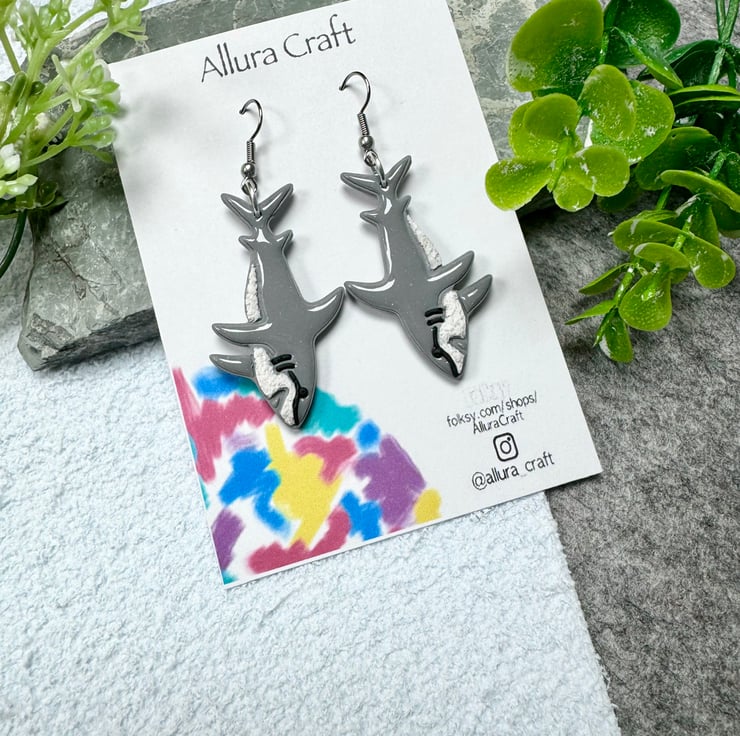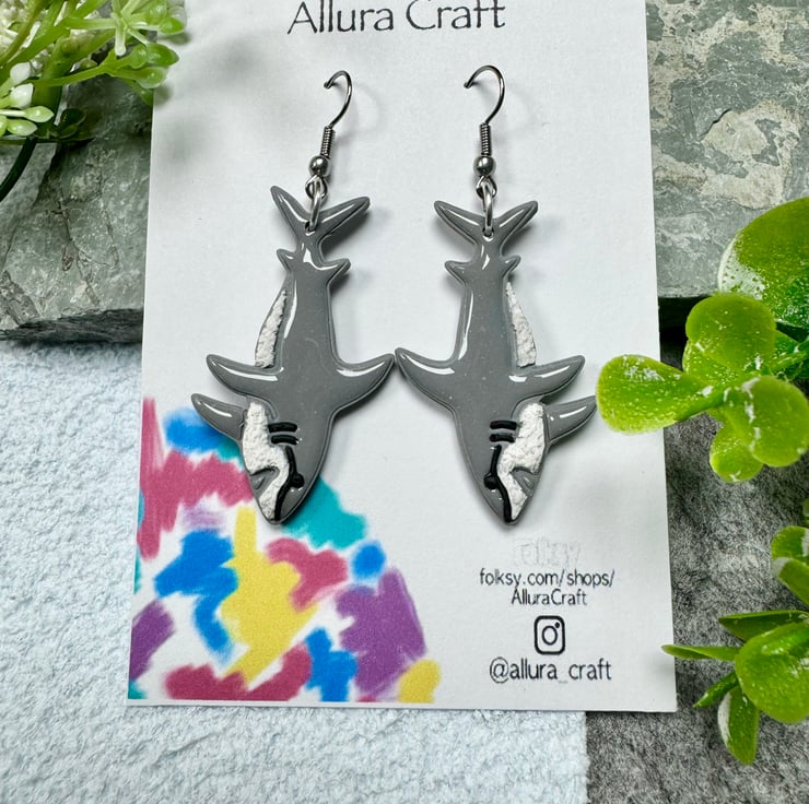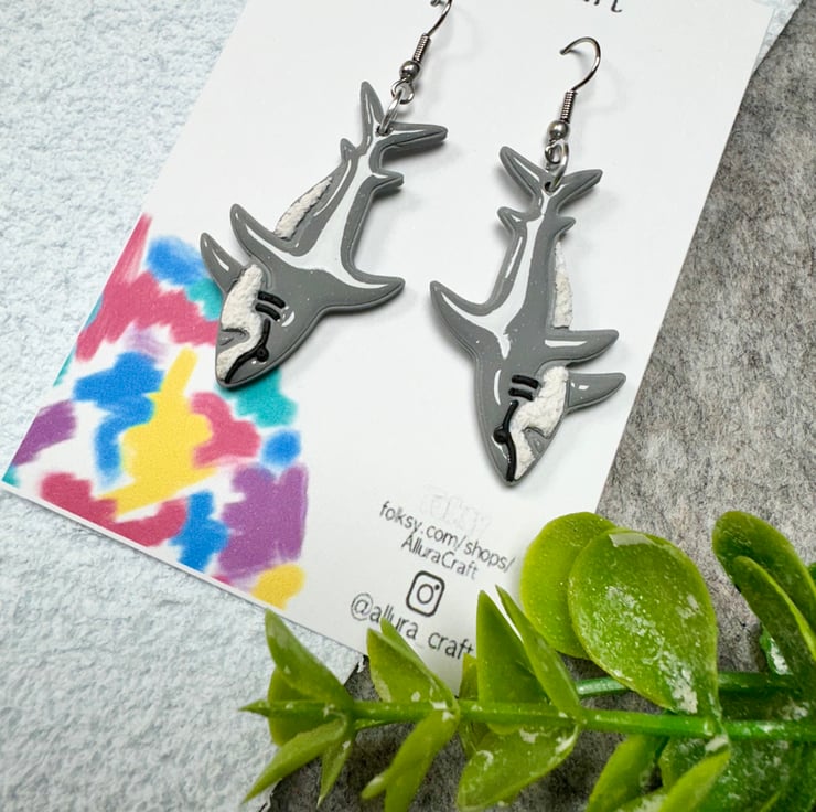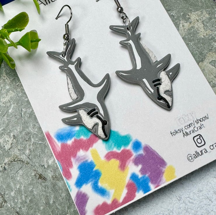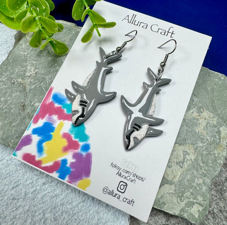 Gorgeous hand mixed unique silver grey forms the base of these bespoke shark earrings