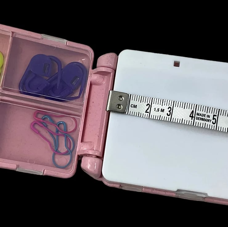 Knitting and crochet notions box, filled with contents