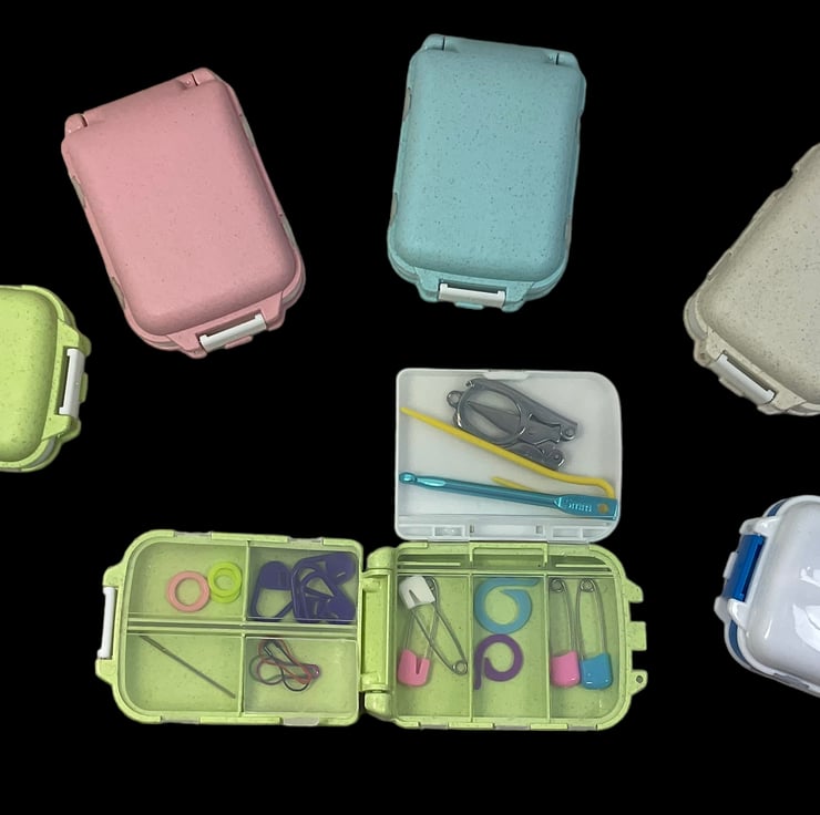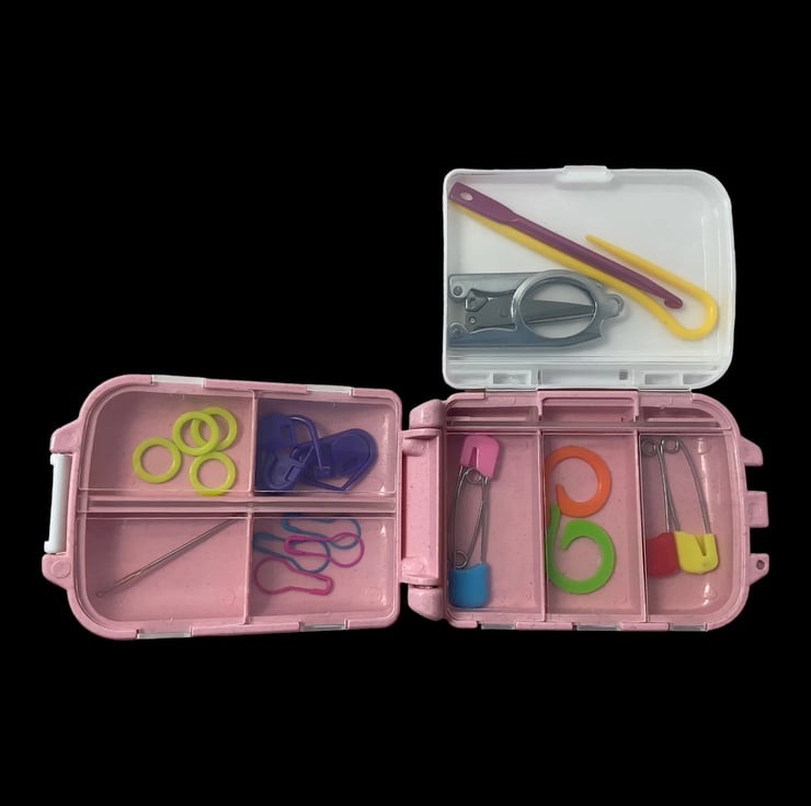 Cute little box the perfect size for your project bag, available with contents I have carefully sourced so they fit perfectly inside the multiple compartments. Available in a range of colours, select from the drop down list.