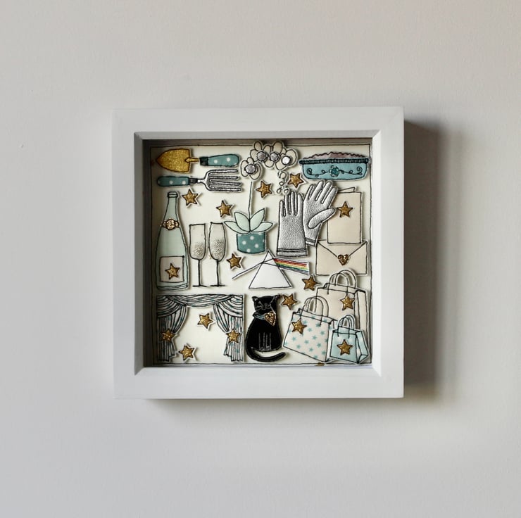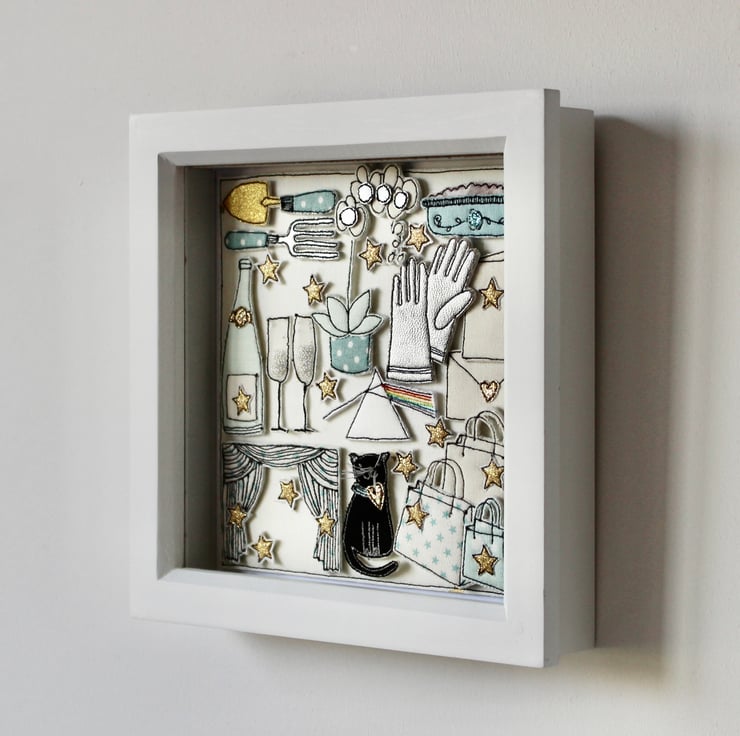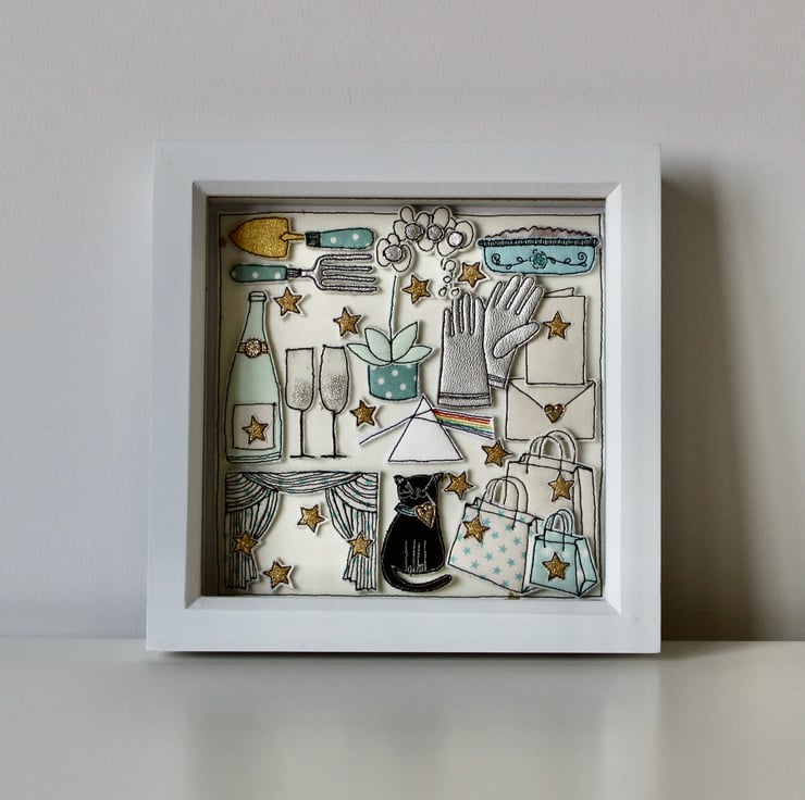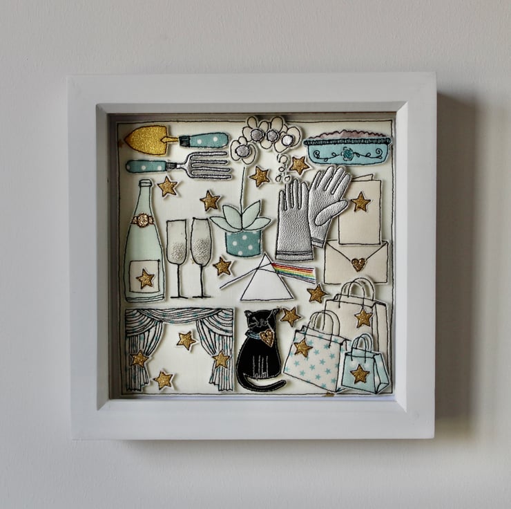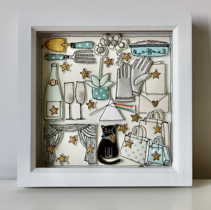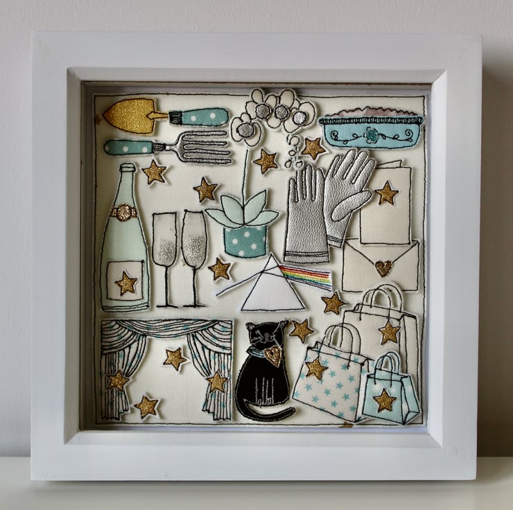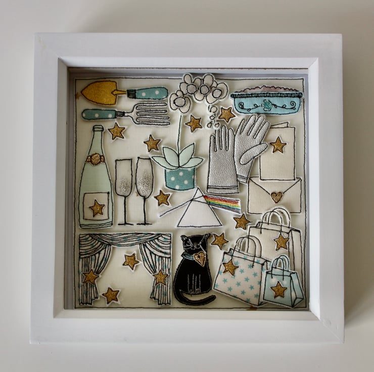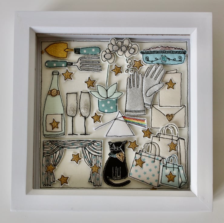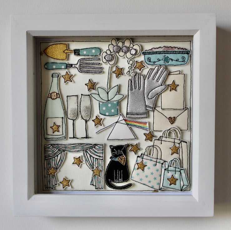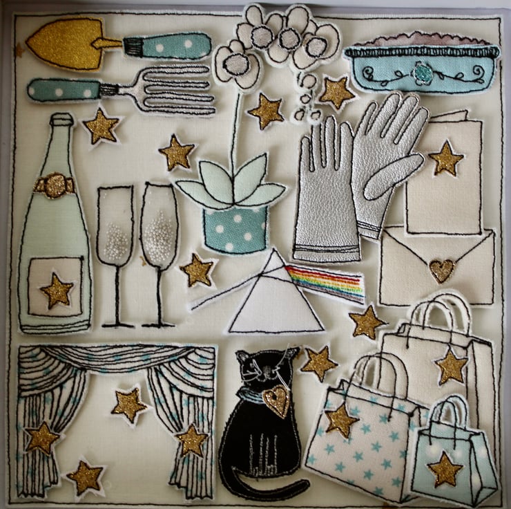 The black cat, trowel and fork, card and envelope, Pink Floyd logo, stars, Champagne bottle and glasses, apple crumble in a dish, theatre curtains, shopping bags and gloves are all created using layers of cloth and free hand machine embroidery. Each is cut out by hand using a very sharp pair of scissors.