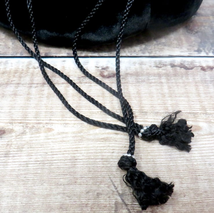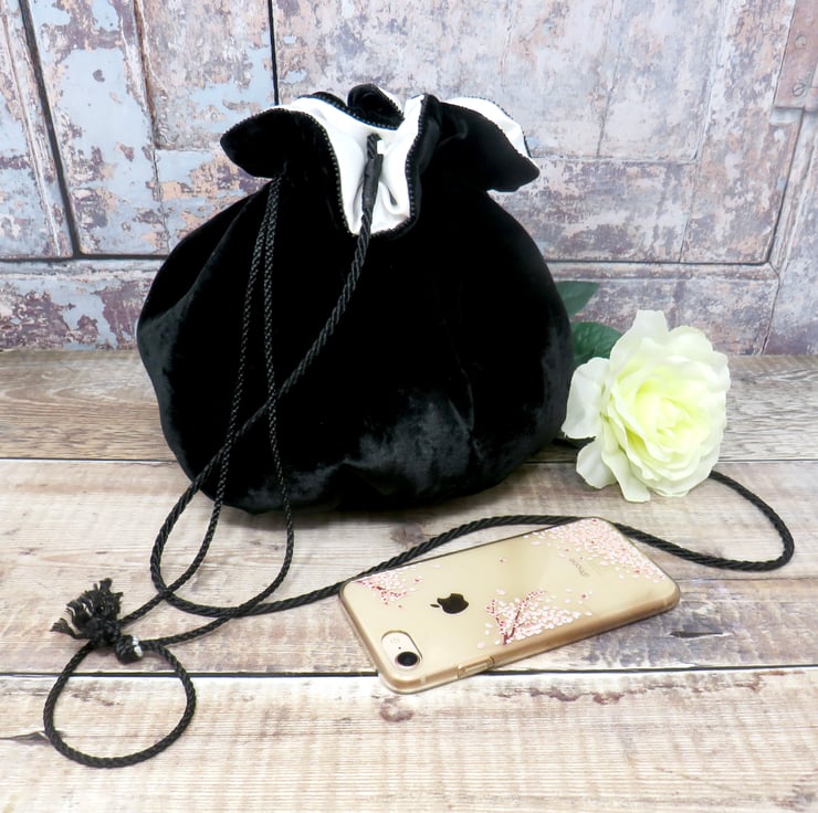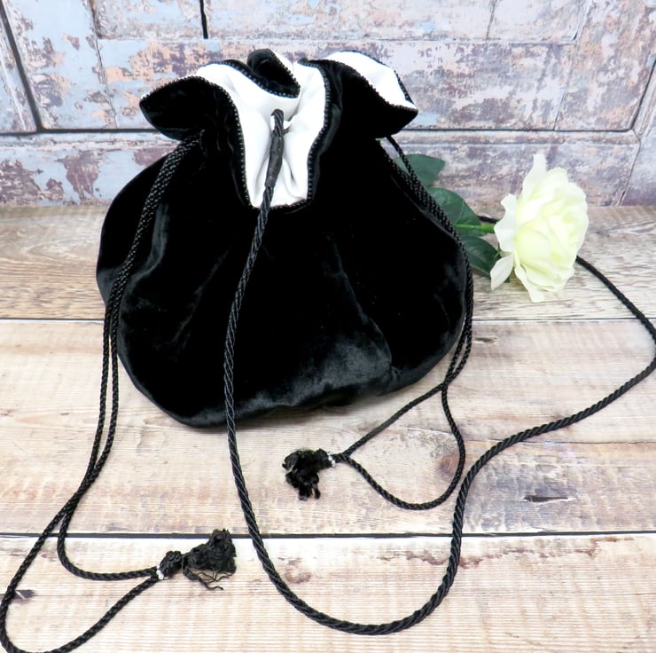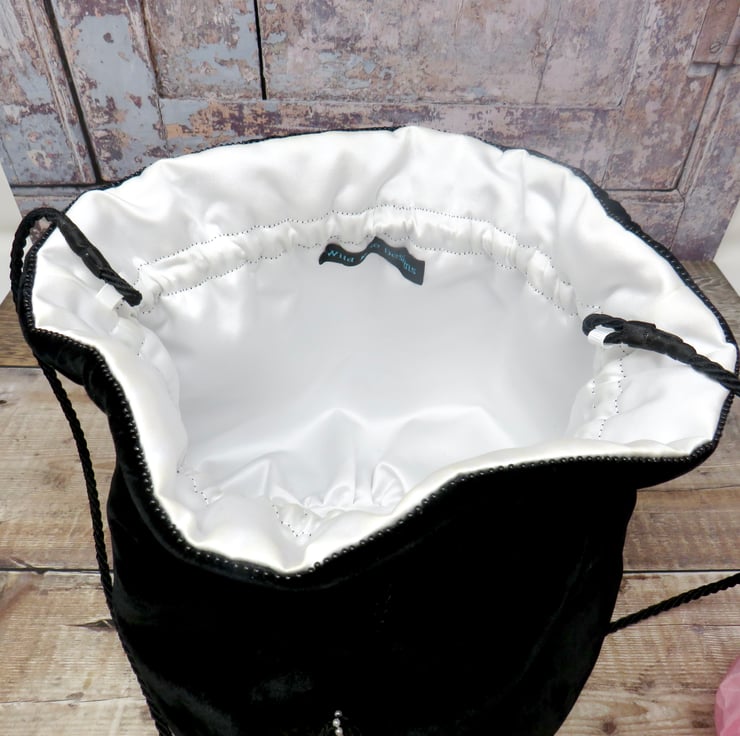 Handmade in a lovely, soft, black velvet that is 20% silk, this larger than average dolly bag is lined in white satin, and has a black bead trim at the top edge. It gathers with a narrow cord, but also has a shoulder strap which can be tucked inside if you prefer to carry it by the draw strings. The bag has an approximate diameter of 23 cm (9") at the base, and is about 20 cm (8") high when fully open - a little less when gathered.