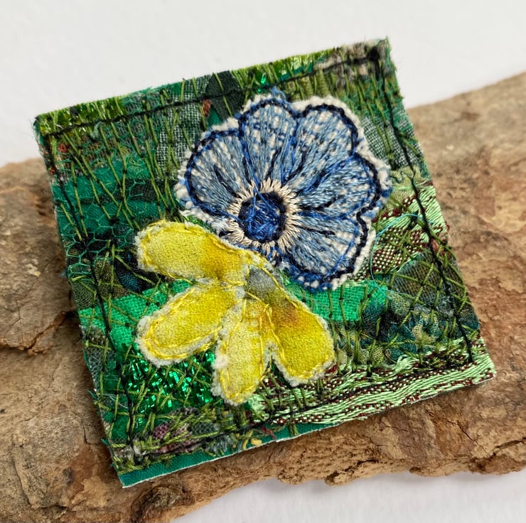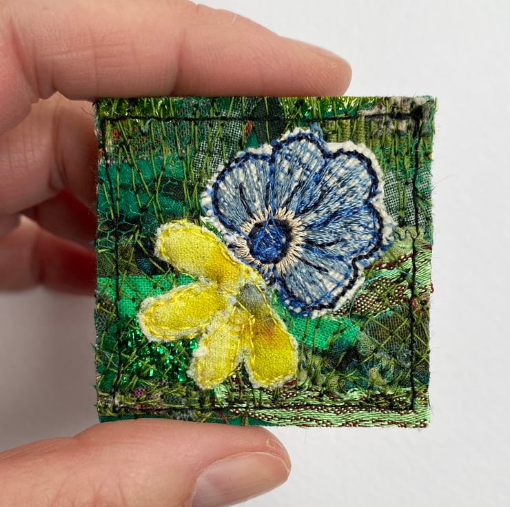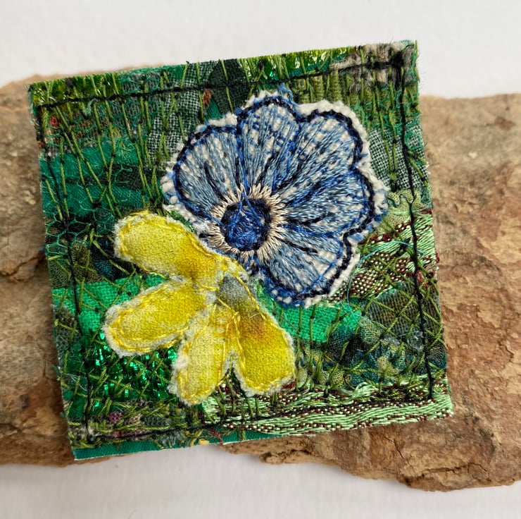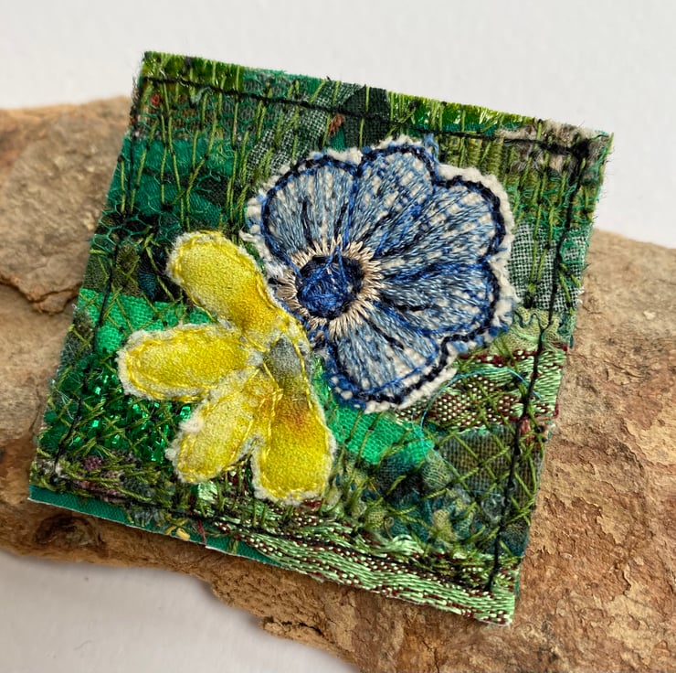 This bright handmade free motion embroidered flower garden brooch is made from up-cycled fabrics and enhanced with free motion embroidery. It is felt backed, and has a brooch pin on the reverse to keep it nice and secure. It measures 5 x 4cm approx.