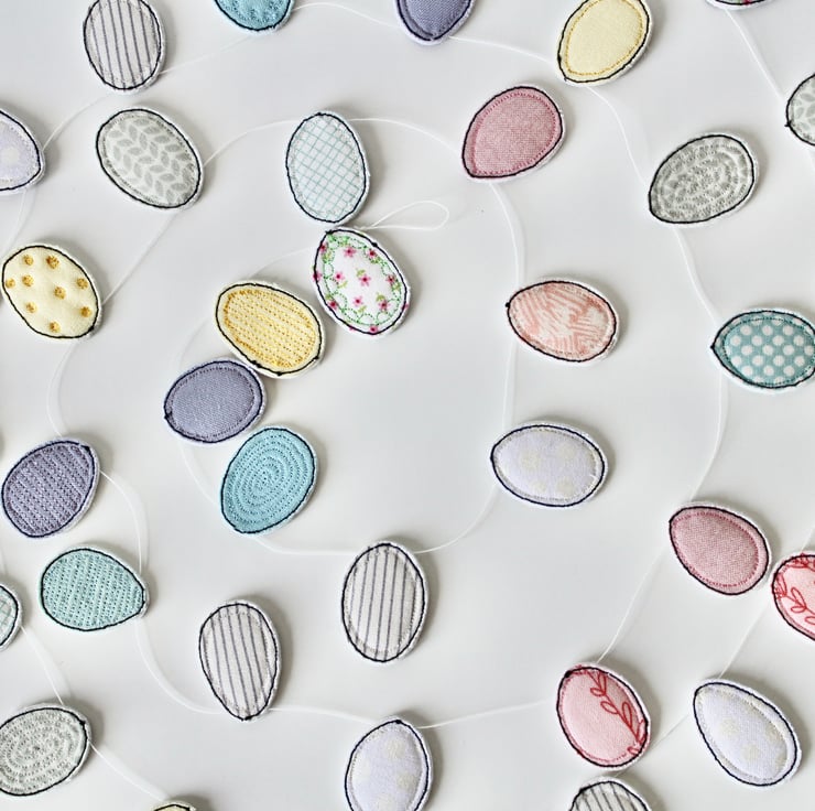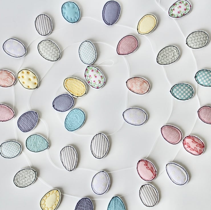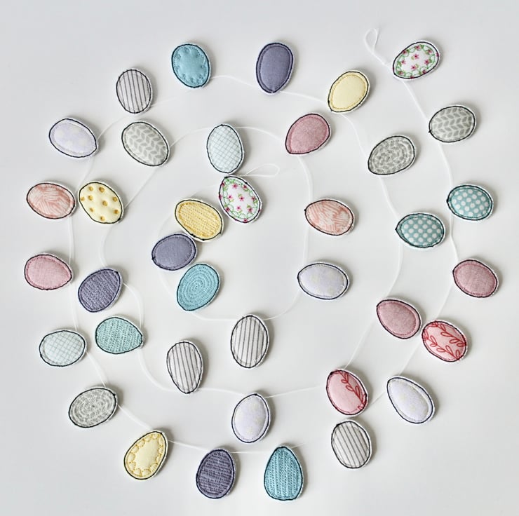 Each of the thirty-eight eggs suspended along this garland, is sewn using a combination of cotton cloth, 100% wool felt and free hand machine embroidery; multiple layers of cloth are sewn together and cut out by hand using very sharp scissors.