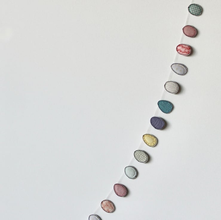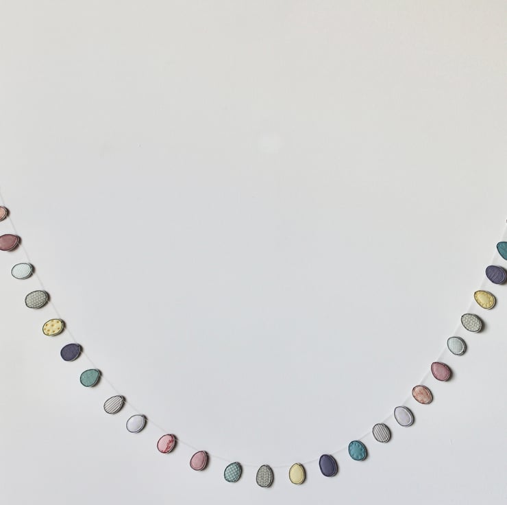 The eggs are suspended on a linen thread and can be moved along the length, allowing a little creativity with spacing.