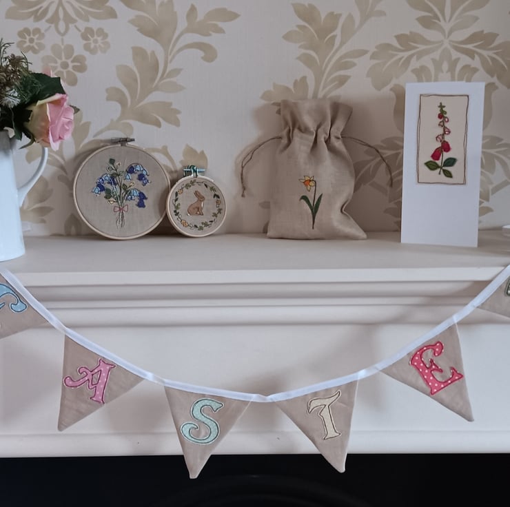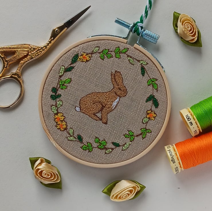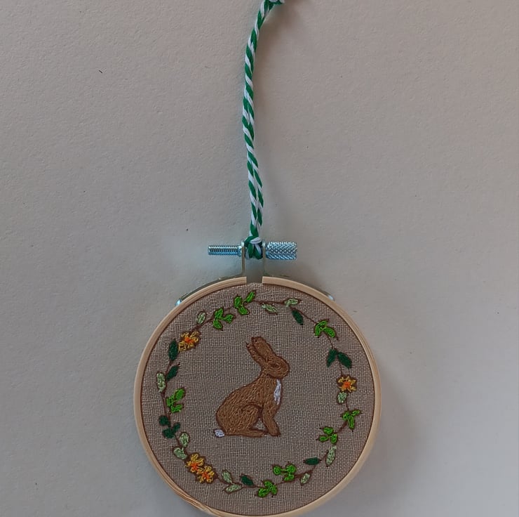 A detailed small hanging embroidery hoop, with a hare and spring foliage design. It is embroidered onto beige linen in different coloured threads using free motion embroidery, and depicts a hare surrounded by a wreath of green foliage and yellow spring flowers.