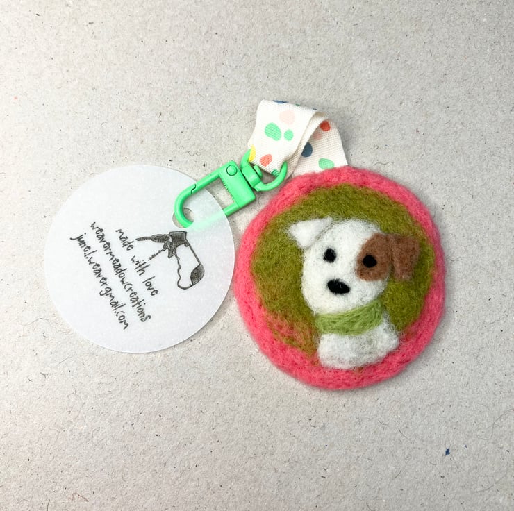 In the sale as it just hasn’t found it’s market. Needle Felted 6cm disks of wool dog portraits with coordinating collar & clip.Not just for keeping you keys easy to find but so helpful with zips ....