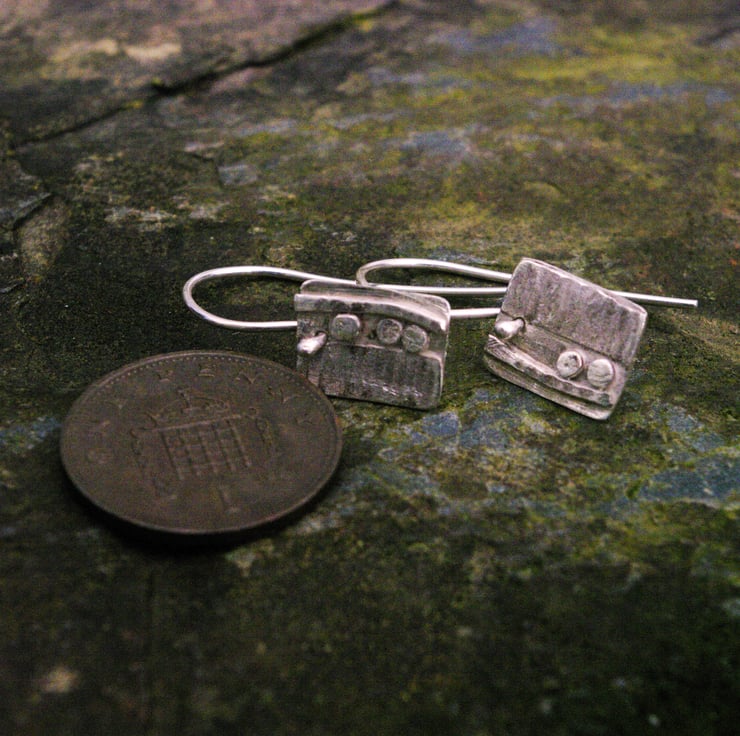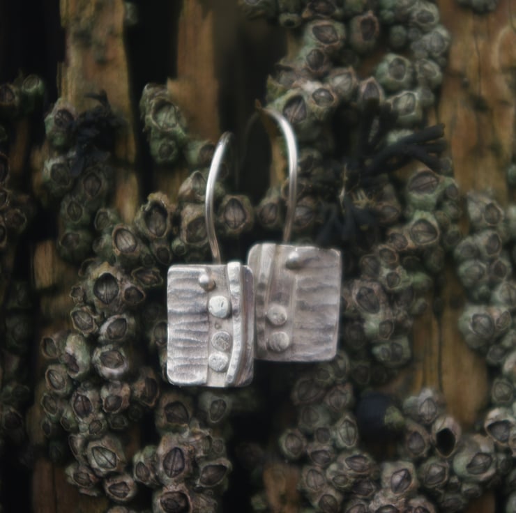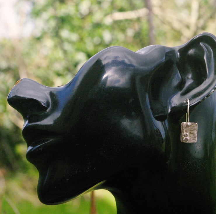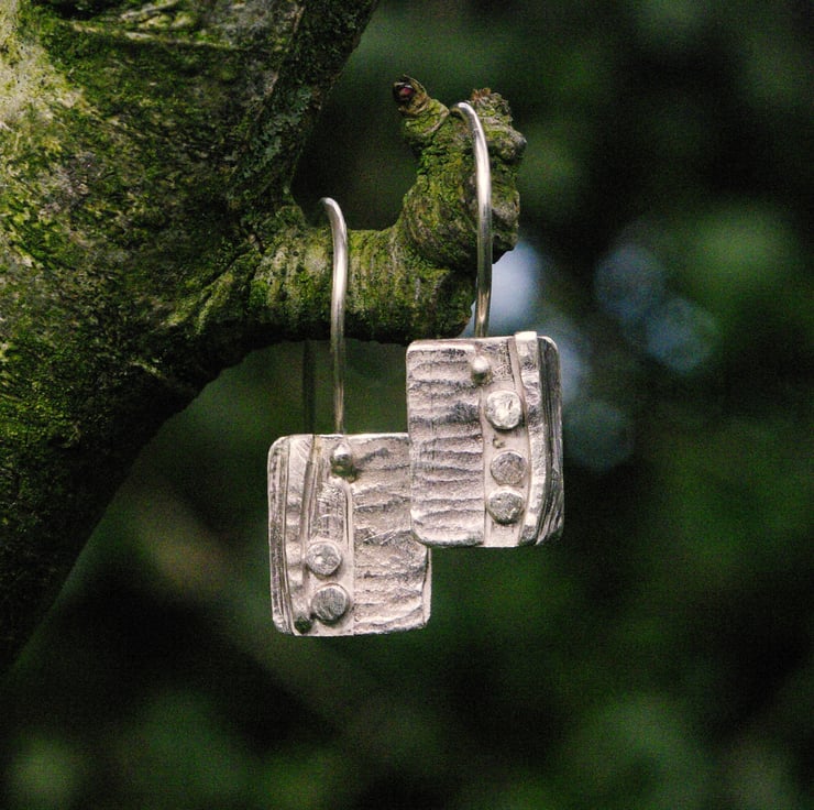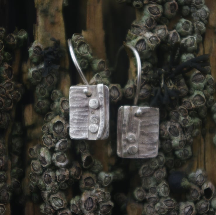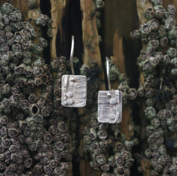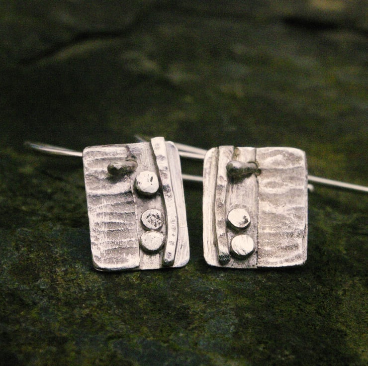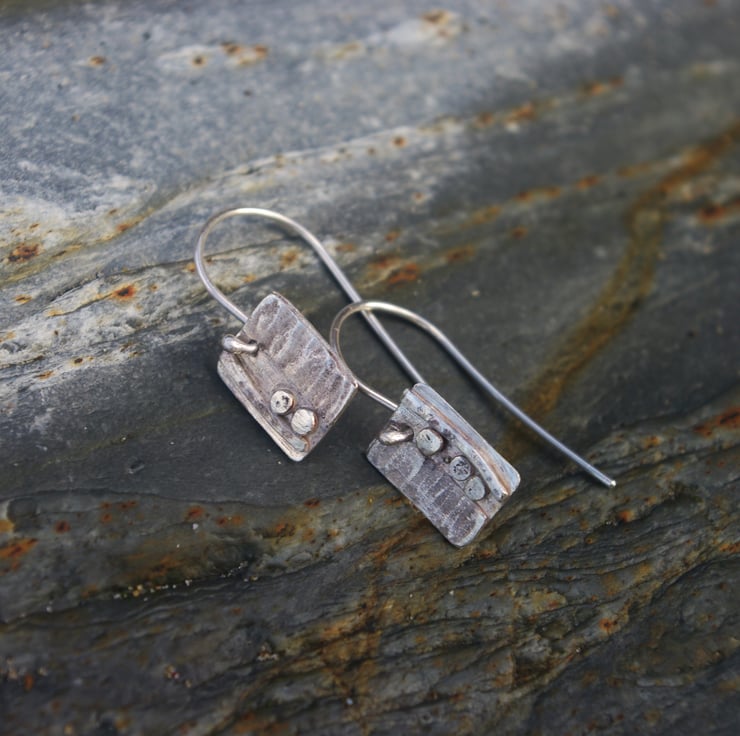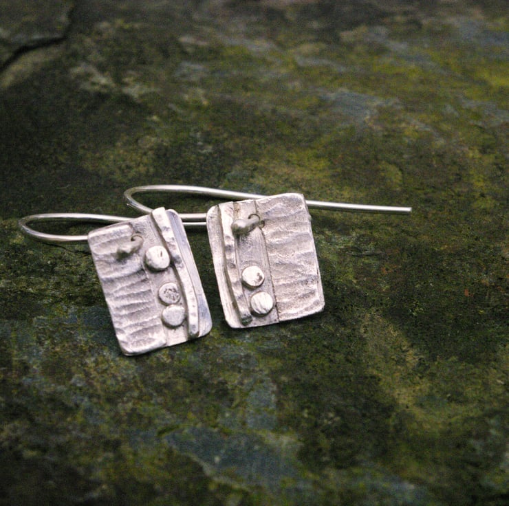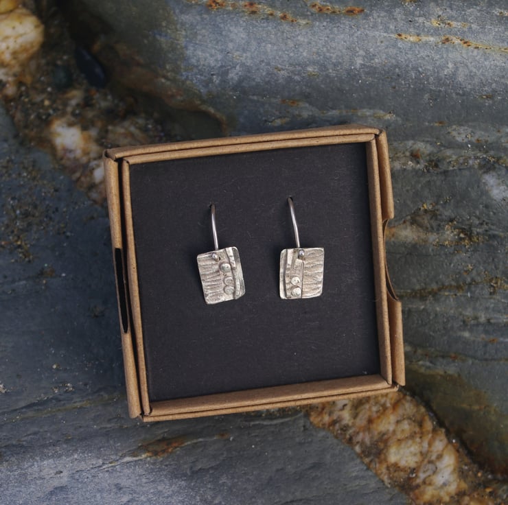 Silver rectangular drop earrings with textural decoration inspired by the weather beaten coast. The rectangles are 9mm x 12mm. The handmade ear hooks are also made from sterling silver with a dangle of 25mm/1 inch.