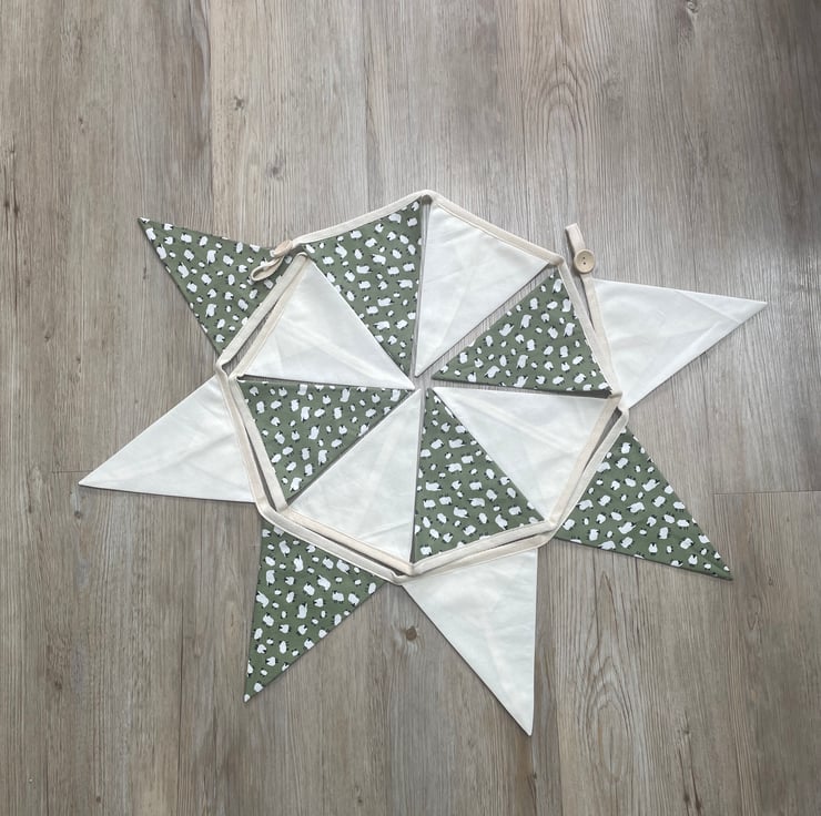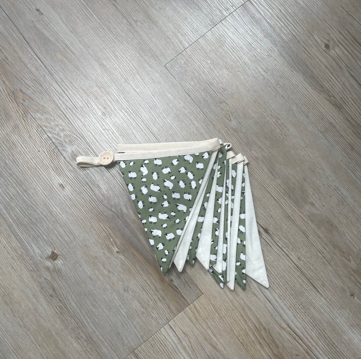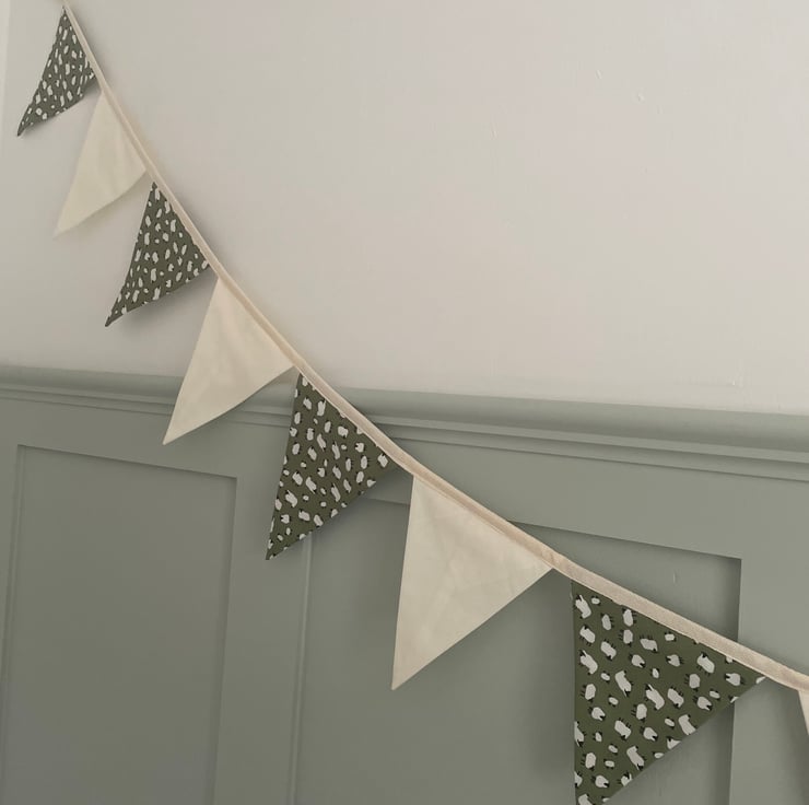 I really love all sage decor at the moment so when I saw this beautiful sage green fabric with little sheep I had to get it to make some bunting, I thought it would be lovely in a nursery with a sage green theme.