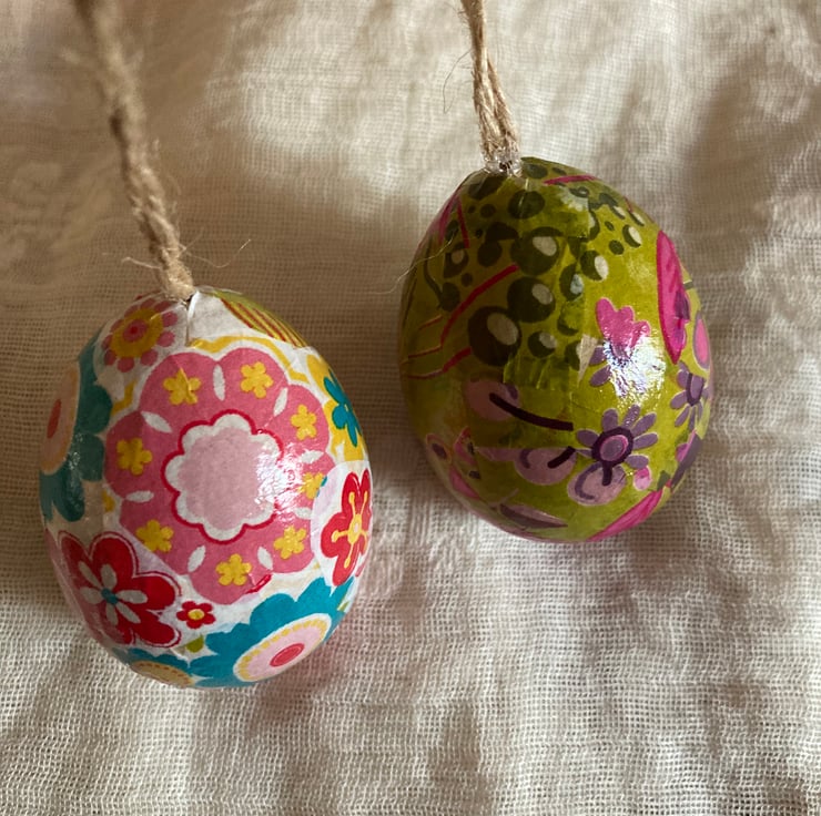 The eggs are paper mache and have been decopatched in pretty papers.