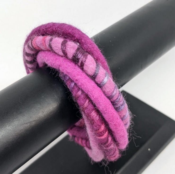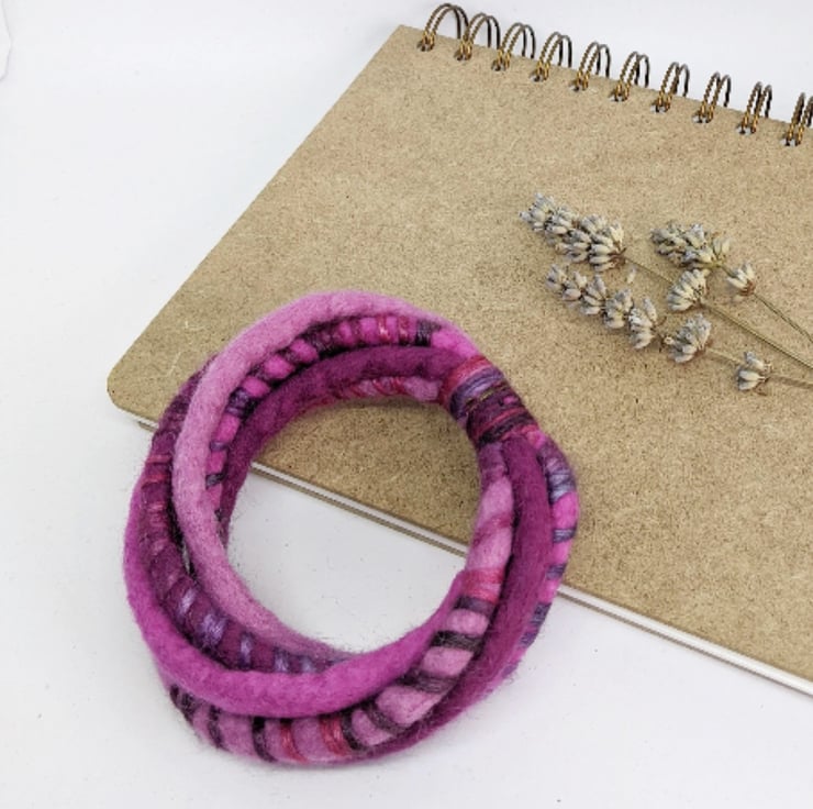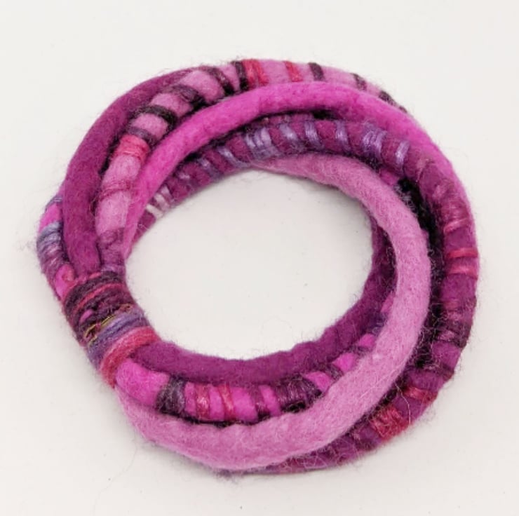 This handmade wet felted bangle twists together felted cords of soft merino wool in shades of deep pink, wrapped with a toning lustrous merino and silk blend yarn. It closes with a strong magnetic fastening.