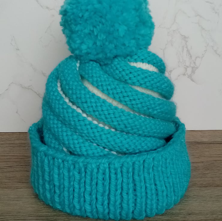 Cupcake swirl hat in vibrant aquamarine with a soft cream inner swirl topped off with a really cute bobble.