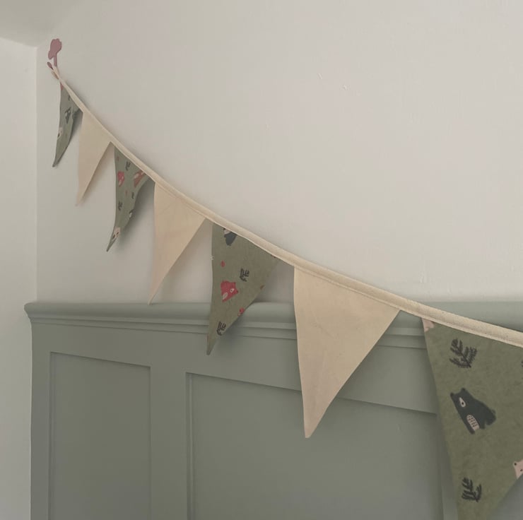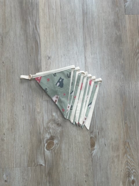 Beautiful sage green bunting with cute bears, trees and mushrooms.