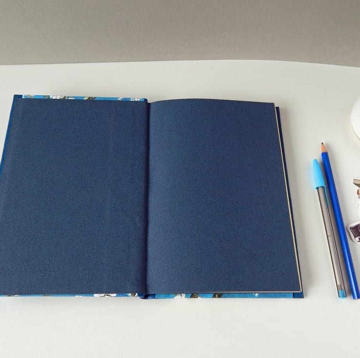The spine and opening edge of the covers are trimmed with blue bookbinding leather.