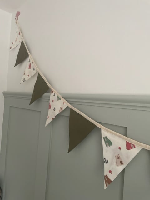 Beautifully full bunting with 14 flags. 7 cream with bears and the others plain sage. Approximately 2.5m long with little hooped ends for hanging with decorative wooden buttons.