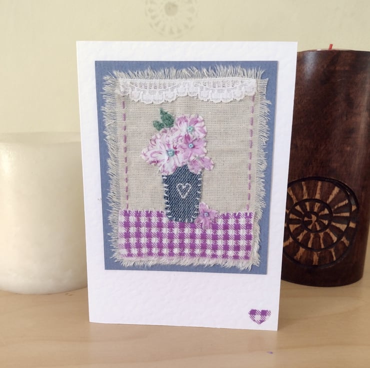 The recycled denim vase has a white stitched edging with a tiny white stitched heart, it sits on top of a purple and white stitch textured gingham fabric and is filled with fussy cut purple fabric flowers with tiny blue beads and a little bit of embroidery.