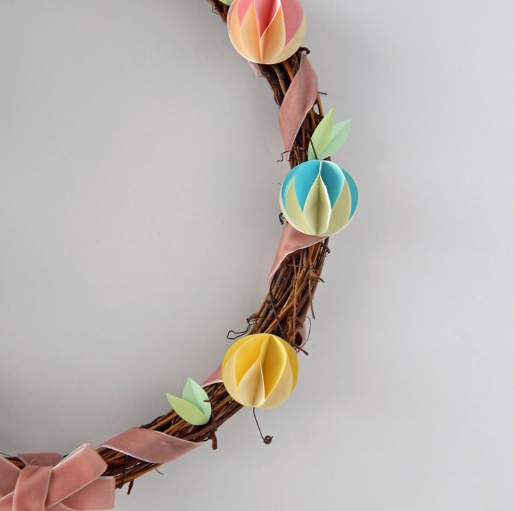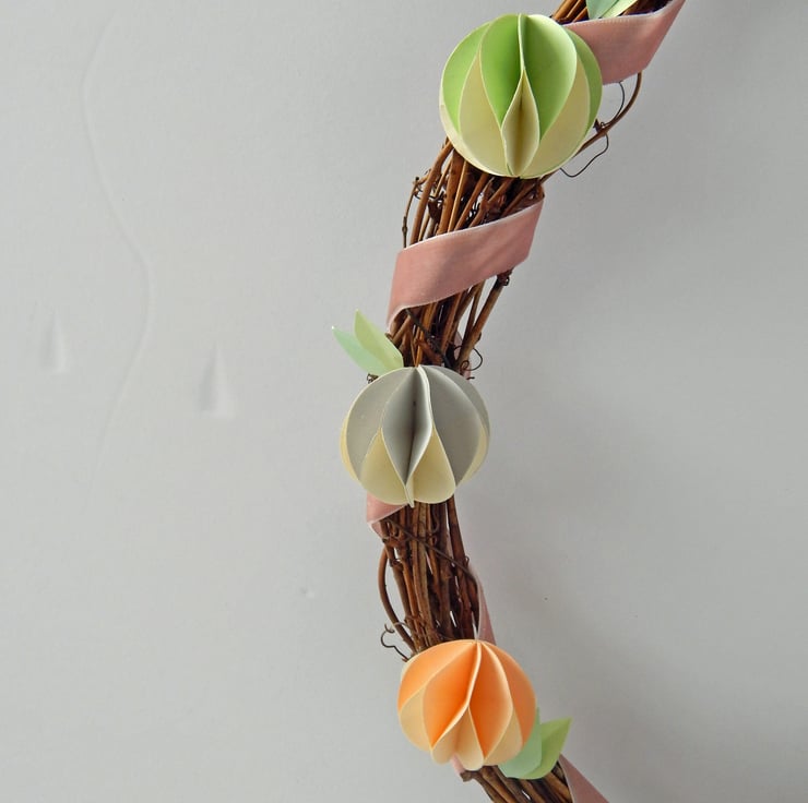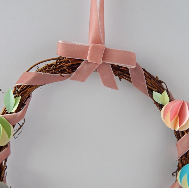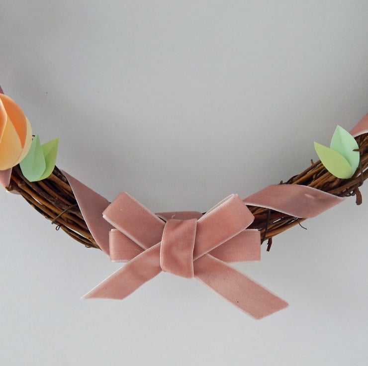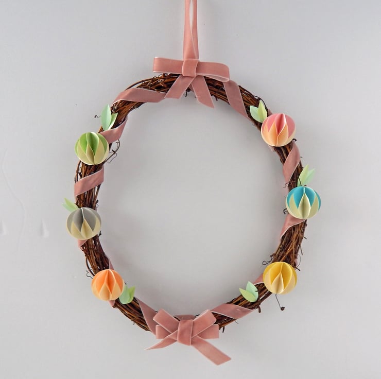 A really pretty Spring themed wreath with pink velvet ribbons and paper honeycomb decorations. Brighten up a sitting room, office or hallway with a touch of springtime.
