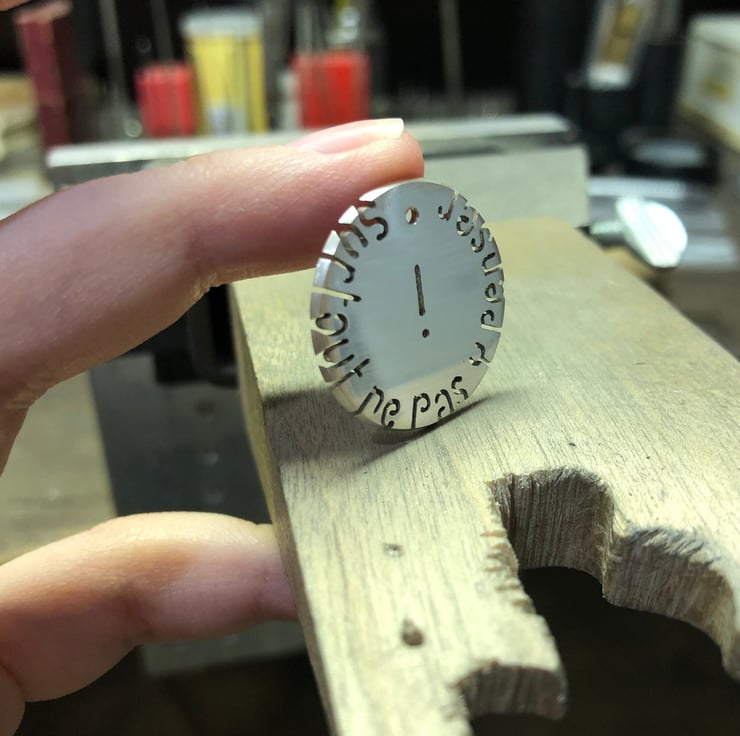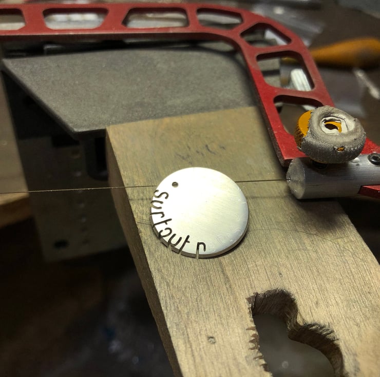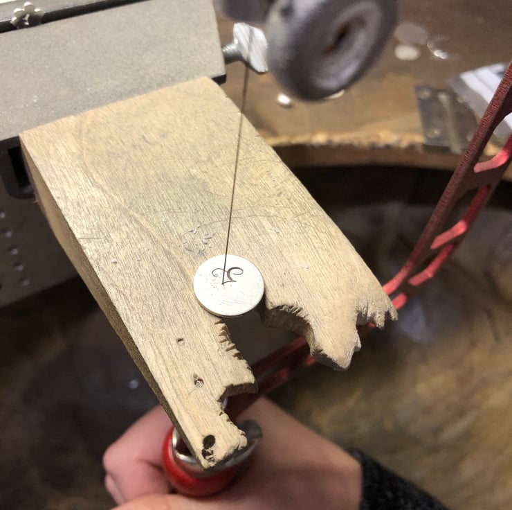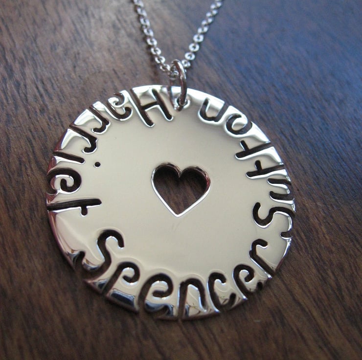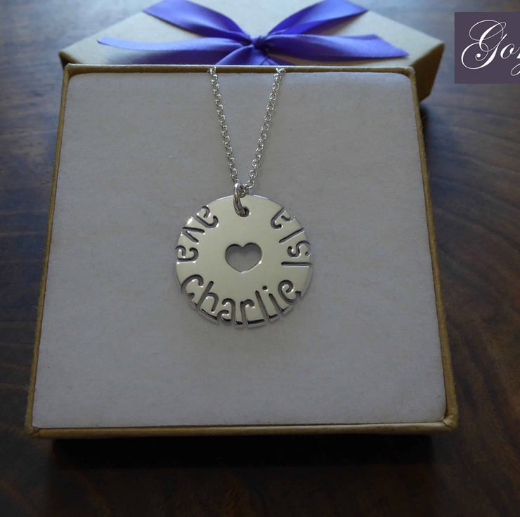 A personalised silver name necklace, each name is hand cut into the edge of a sterling silver circle. The circle is approximately 1.2mm thick and usually around 2.5cm1" wide although the size will vary depending on the names given.