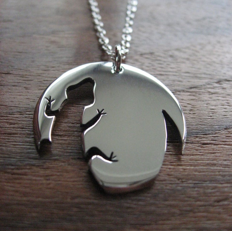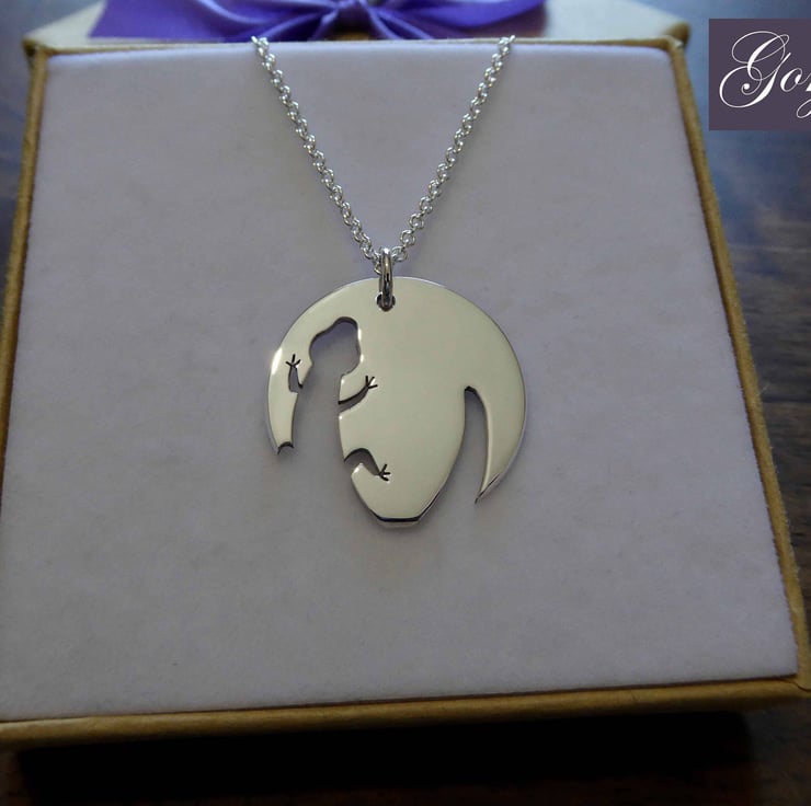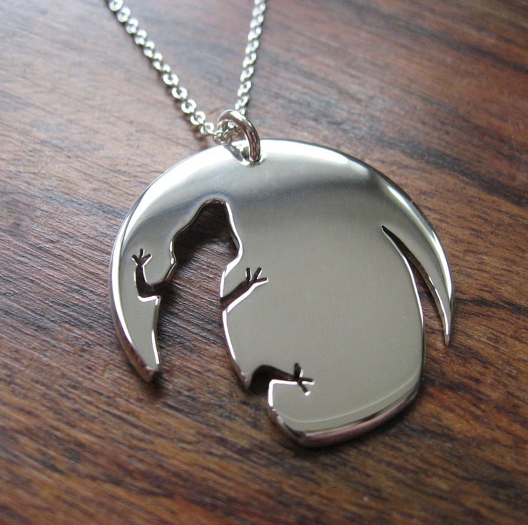 A silver lizard pendant, it is hand cut from a piece of 1.2mm thick sterling silver, the lizard detail is hand cut as well and the pendant can have the option of a polished or satin finish.