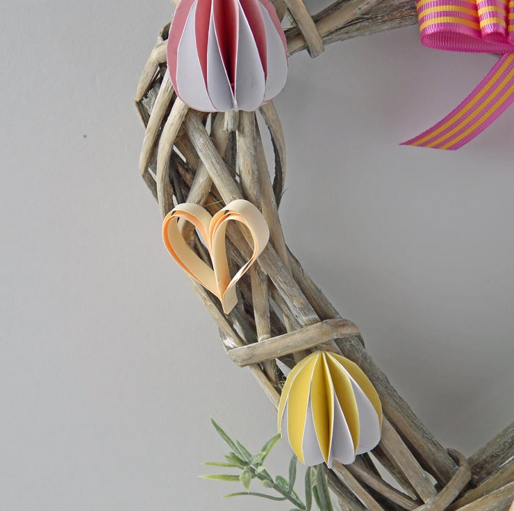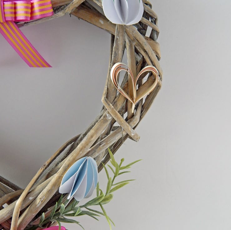 - Around the wreath are four pastel and white paper egg decorations with two layered paper hearts in between. All are hand made with pastel papers.