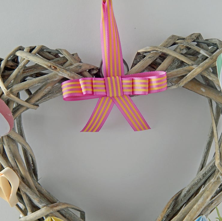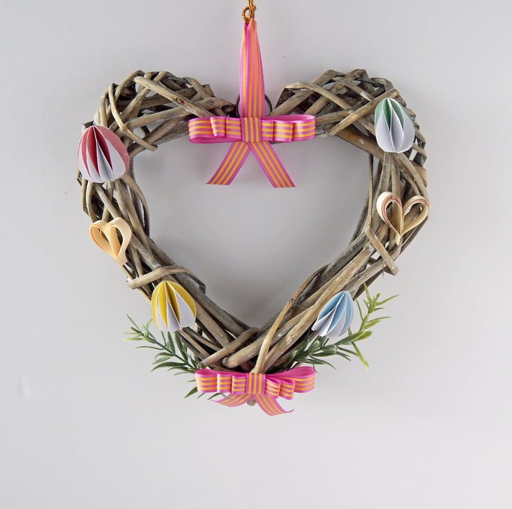 This heart shaped wicker wreath is decorated for Springtime, with paper eggs, hearts and leaves, plus bows of ribbon. Use it to brighten up your home or office.