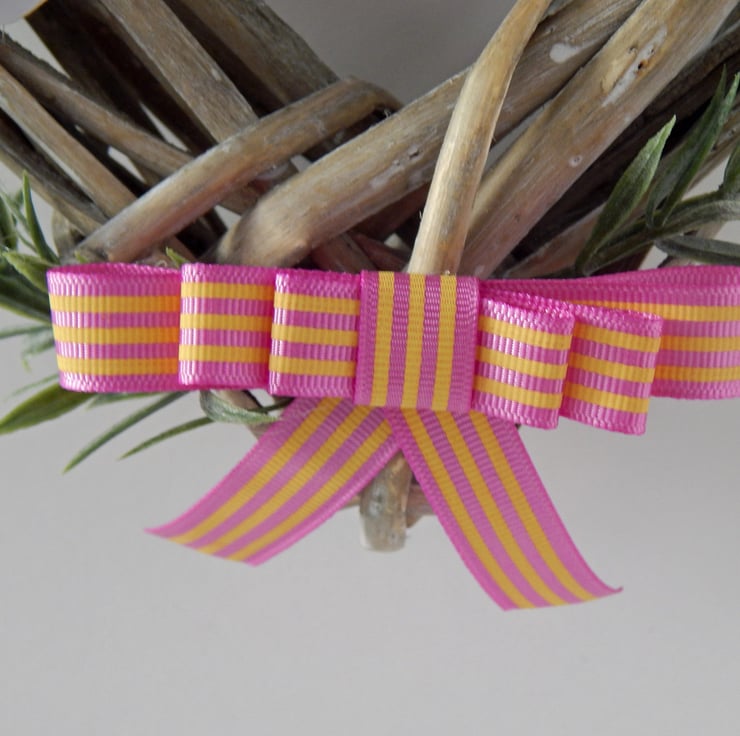 - Bows of striped pink and yellow grosgrain ribbon trim the top and bottom of the wreath, with a hanging loop at the top. There is also a wire hanging loop, fixed into the frame of the wreath base.