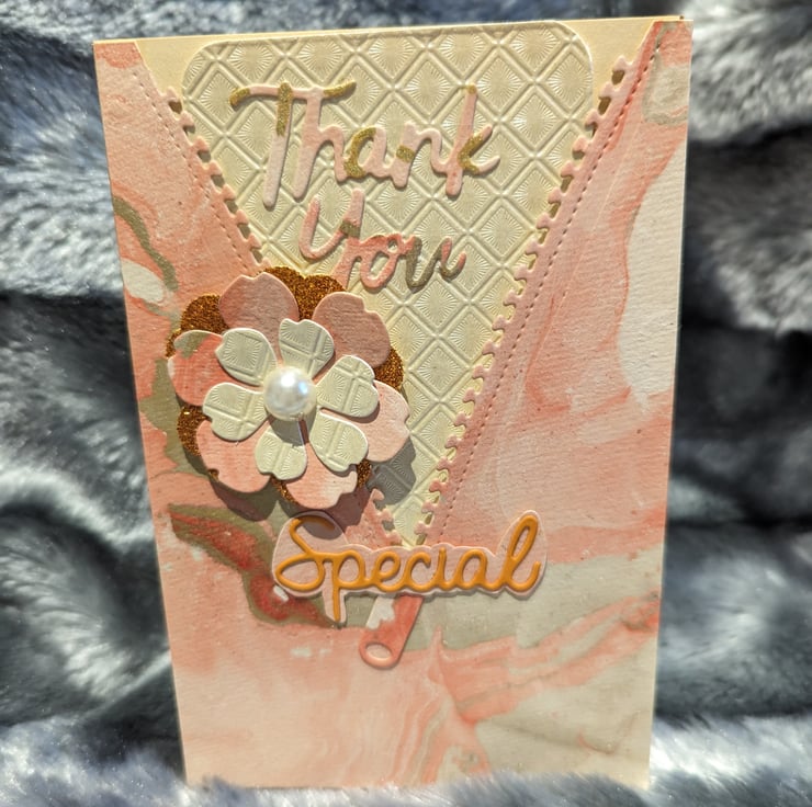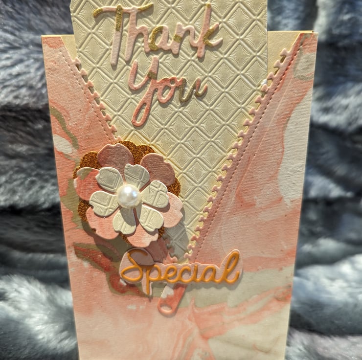 A pretty flower in contrasting card stock with a faux pearl sticky gem in the middle sits on the left hand side of the zipped top and a pull out 'Thank You' card gives you more room on the reverse of that as well as inside the card, for that special message.
