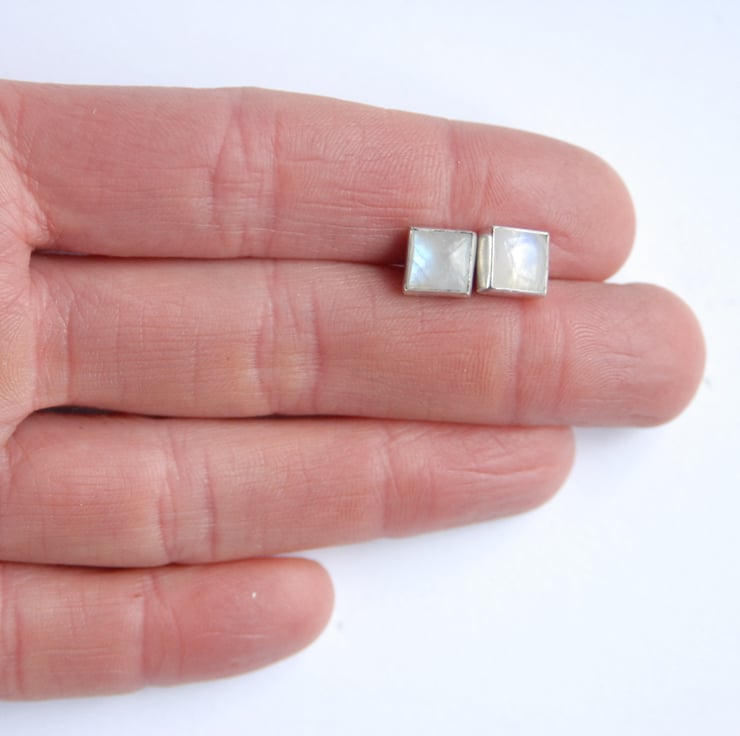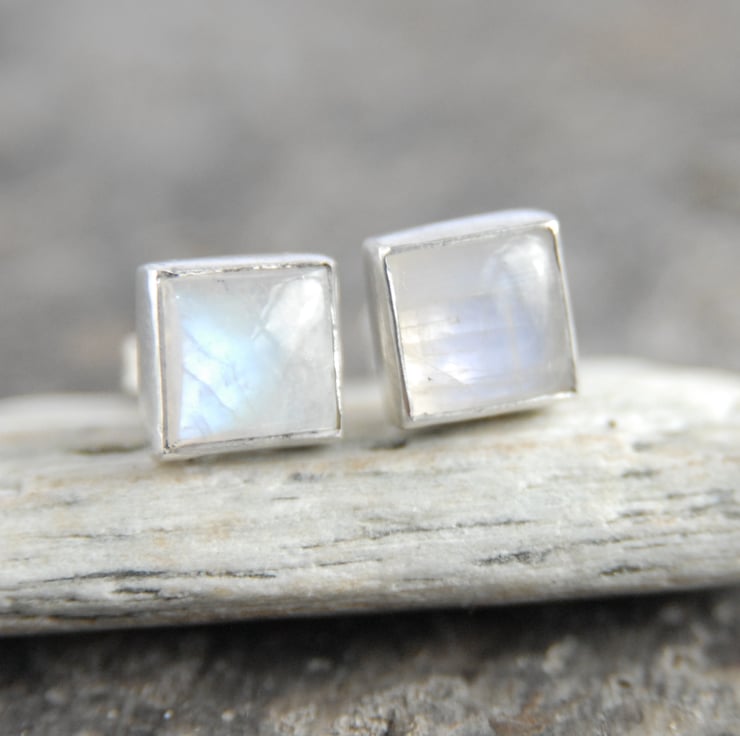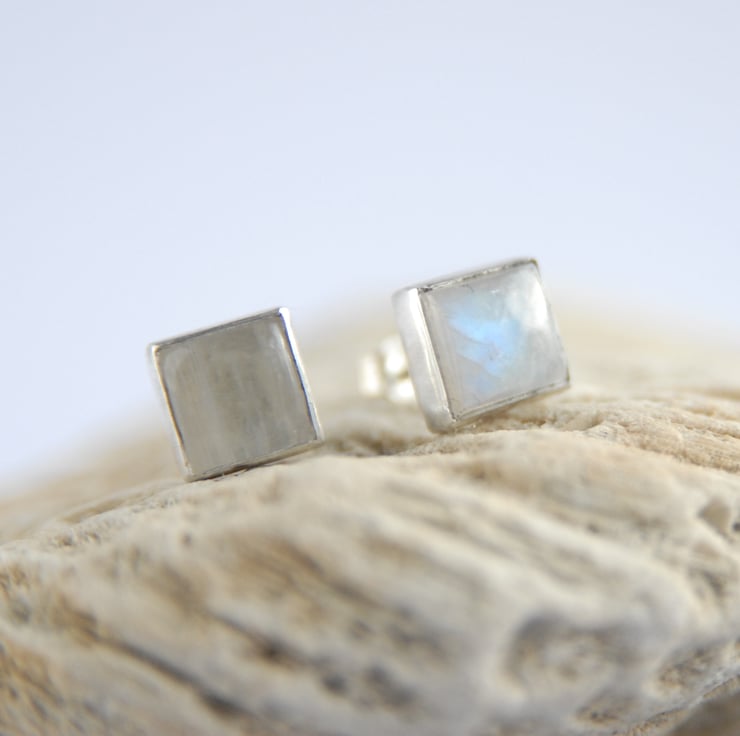 These square stud earrings feature bezel set rainbow moonstone cabochons and are finished off with sterling silver posts and scrolls. The moonstones have a semi translucent clear / white body colour with the typical blue flash (one has a sky blue blue flash, the other is more royal blue). The studs are approx 8mm square and 4mm thick. The post is mounted centrally in the square.