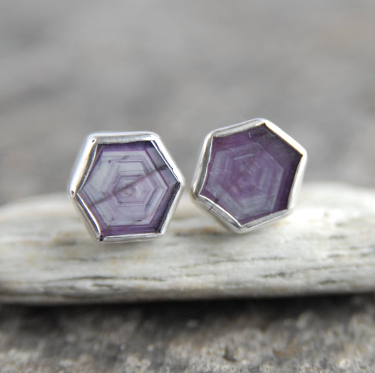 These unusual stud earrings feature hexagonal sapphire crystals smoothly bezel set in sterling silver and finished off with sterling silver posts and scrolls. The sapphires are a purpley pink colour and display a strong silver 'flash' along crystal growth planes, very unusual and sure to be a talking point. Because the shape is based on the natural crystal structure the hexagons aren't a perfectly matched pair but they are pretty close. The studs measure approx 10mm across the widest point and are about 4mm deep with a flat top.