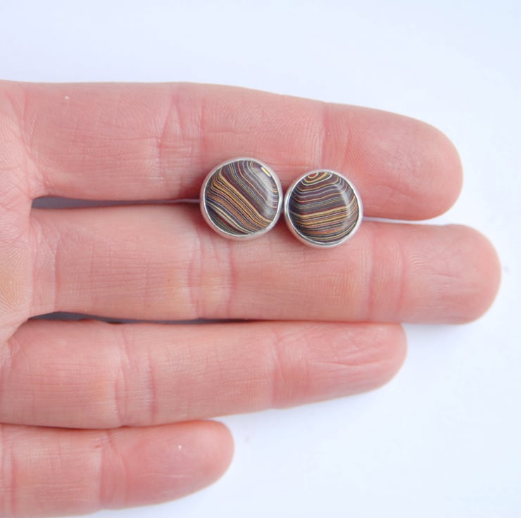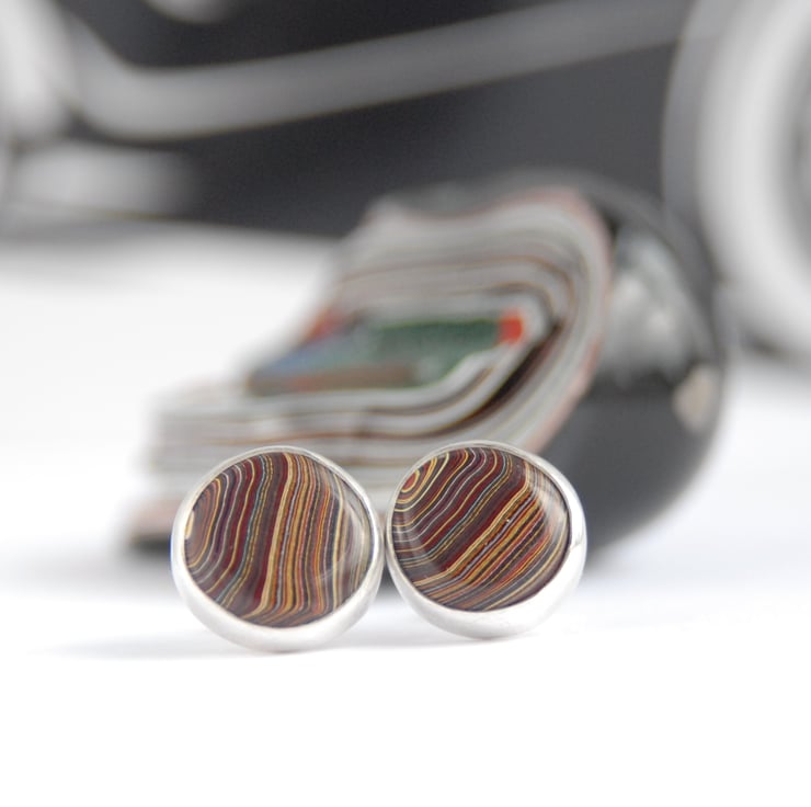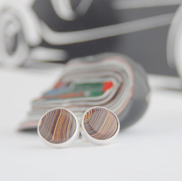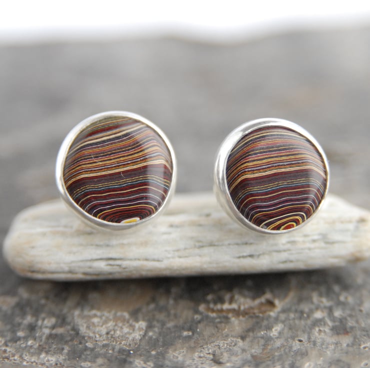 These stud earrings feature finely striped fordite which has been bezel set in sterling silver and they have been finished with silver posts and scrolls. The fordite has very fine stripes of red, maroon, yellow and white with a little black and blue. The studs measure 13mm diameter with the post central to the earring, fordite is lightweight so these aren't heavy in the earlobe. Comes gift boxed.