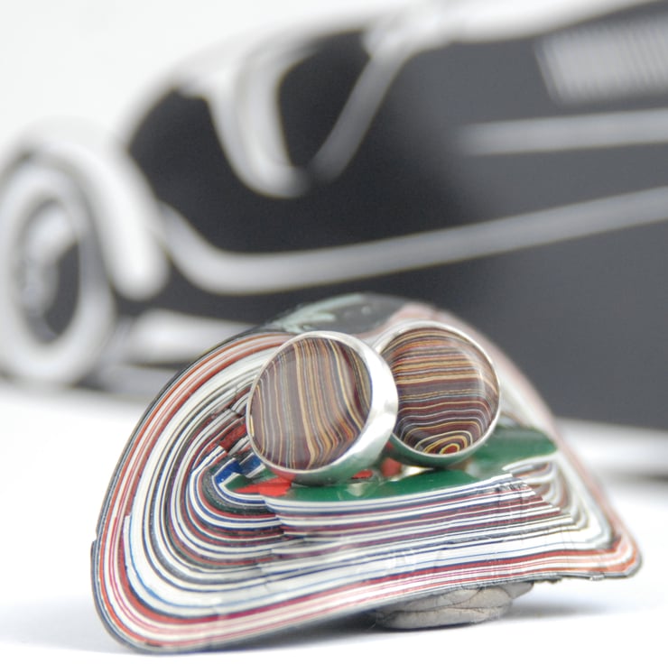 Not come across fordite before? It is the name given to waste spray paint that forms at automotive factories. Each vehicle adds new layer of paint to the build up and it gets baked hard after each one. Lapidarists discovered that it could be cut and polished to show off the multitude of colours. This particular material came from the Corvette factory in Bowling Green, Kentucky, probably between 2005-2015 (the sample contains velocity yellow which was produced between those years). I cut and polish this material myself and have quite a stash from a range of years and factories so if you like the idea of fordite but want something else drop me a message.