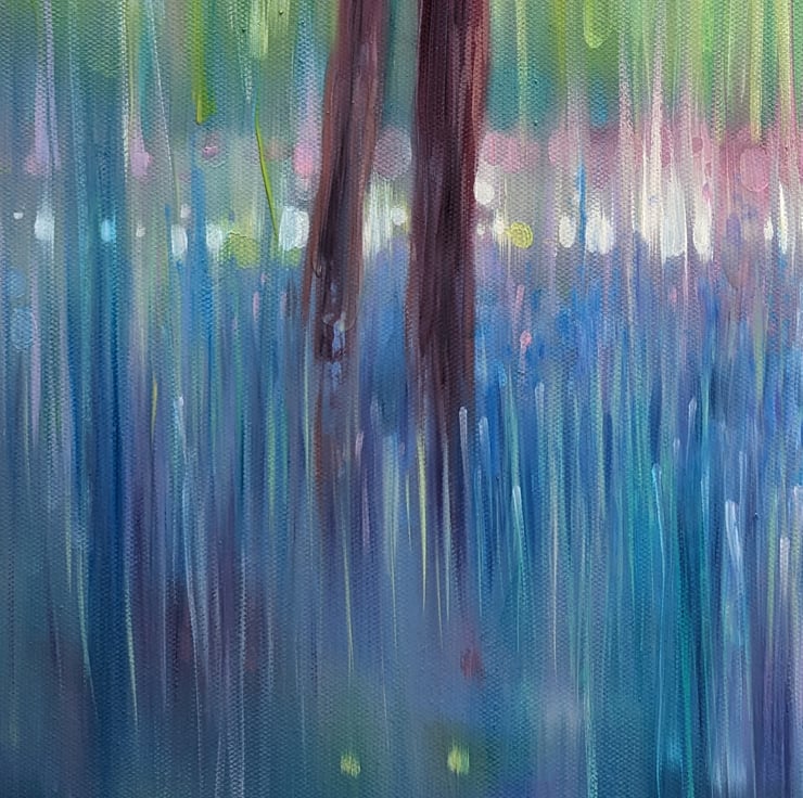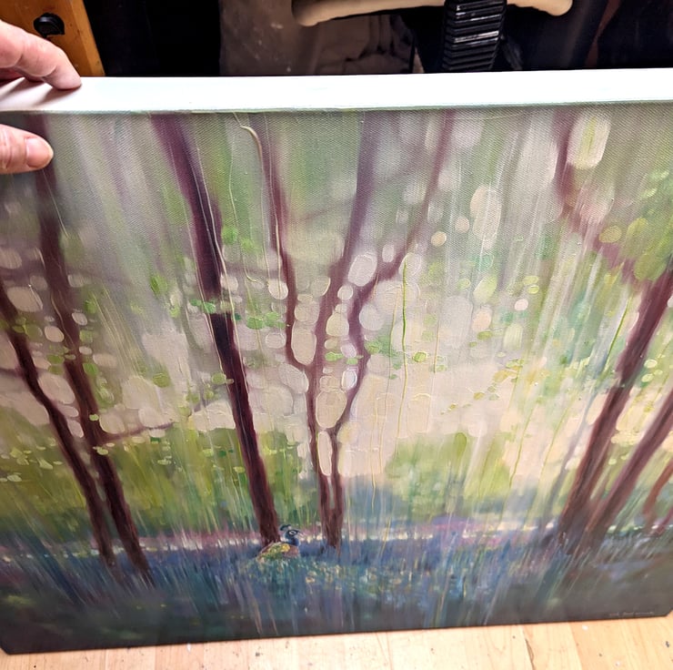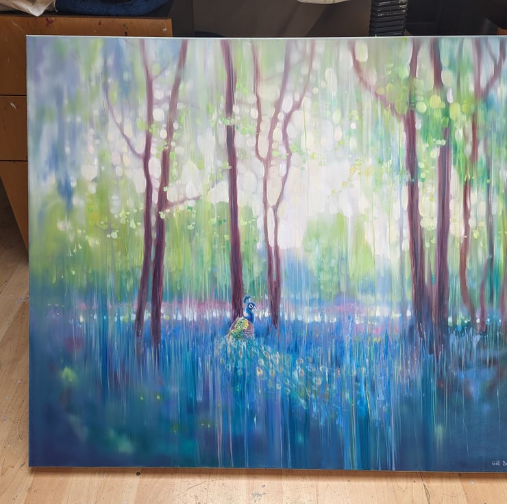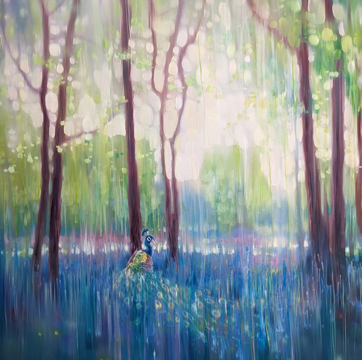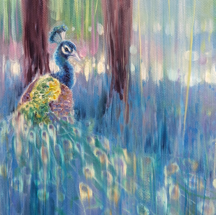 In His Element is a vibrant semi abstract oil painting of a peacock blending into in a magical bluebell wood. It is 36x30x1.5 inches. The peacock is looking to his right under the green spring woodland trees. His tail is spread out around him and is sinking into the lush carpet of bluebells. His colours match the scene beautifully which is why he is in his element. The painting style is semi abstract, slightly art nouveau and is depicted in an exuberant, loose and blurry way so that it seems to shimmer. The vertical layers and lines are like a curtain that present different aspects of the same scene simultaneously. The concept of the painting was simply the idea of seeing a peacock in a bluebell wood. I would like to see it! Peacocks, for me, represent something exotic and gorgeous and strange and bluebells are equally exotic and gorgeous and strange. Painted on 3D canvas, edges white, ready to hang, no frame needed.