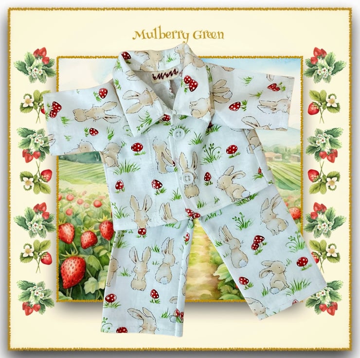 Adorable little pyjamas in a cute bunny print, to fit the Mulberry Green characters. The pyjamas are made from best quality cotton and fasten at the front with two little poppers underneath the buttons.