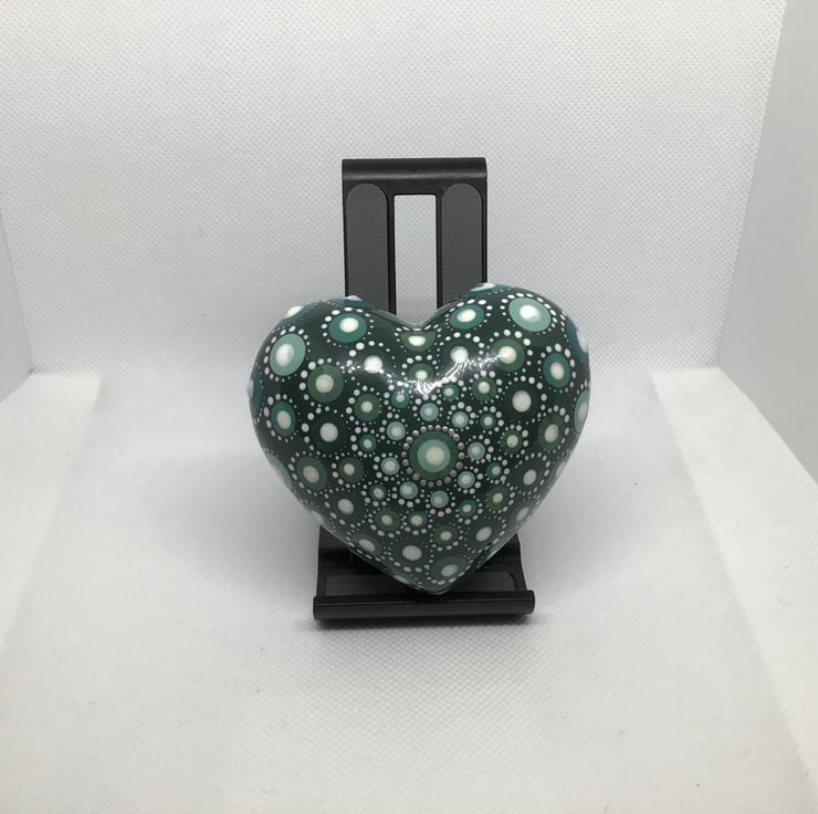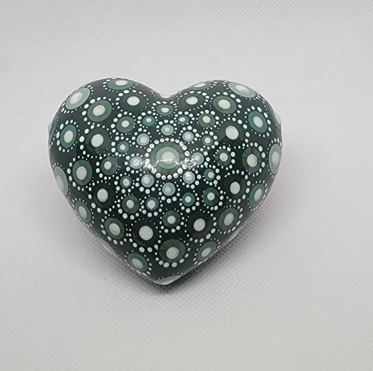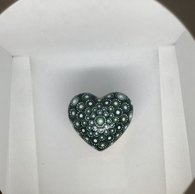 Unique stonecast, hand painted, heart shaped pebble. This beautiful hand painted stone is ideal to gift a loved one. Dotted in several shades of green in a beautiful cylindrical pattern. H:7cm, w:7.5cm, d:3.5cm (approx). SOLD