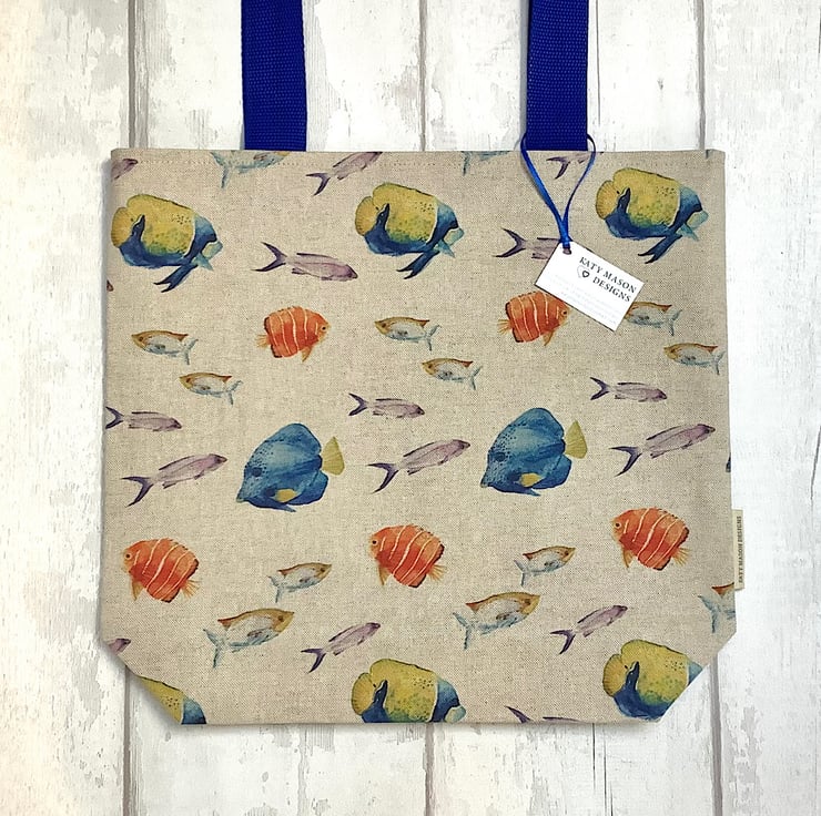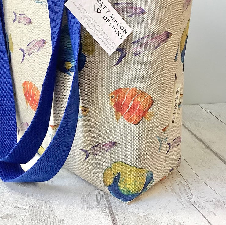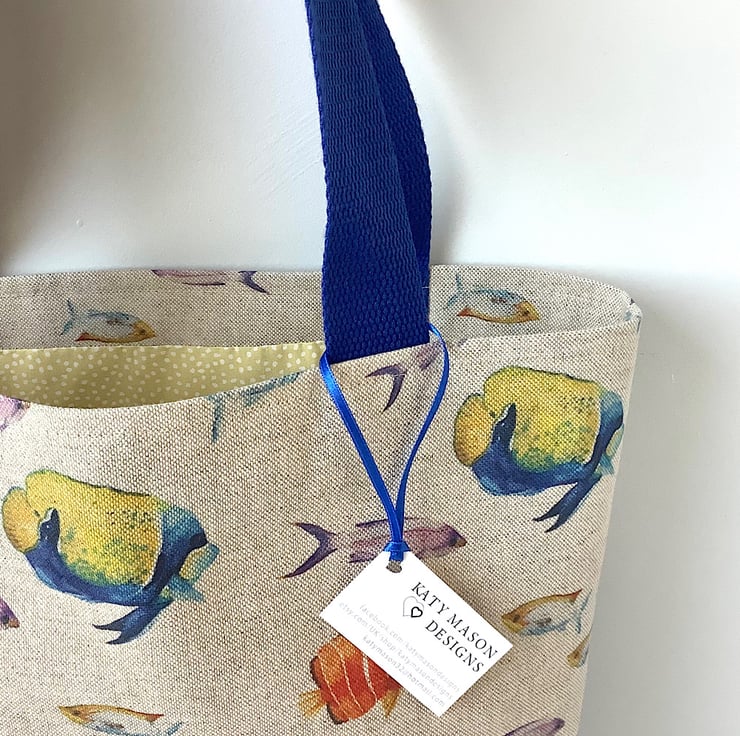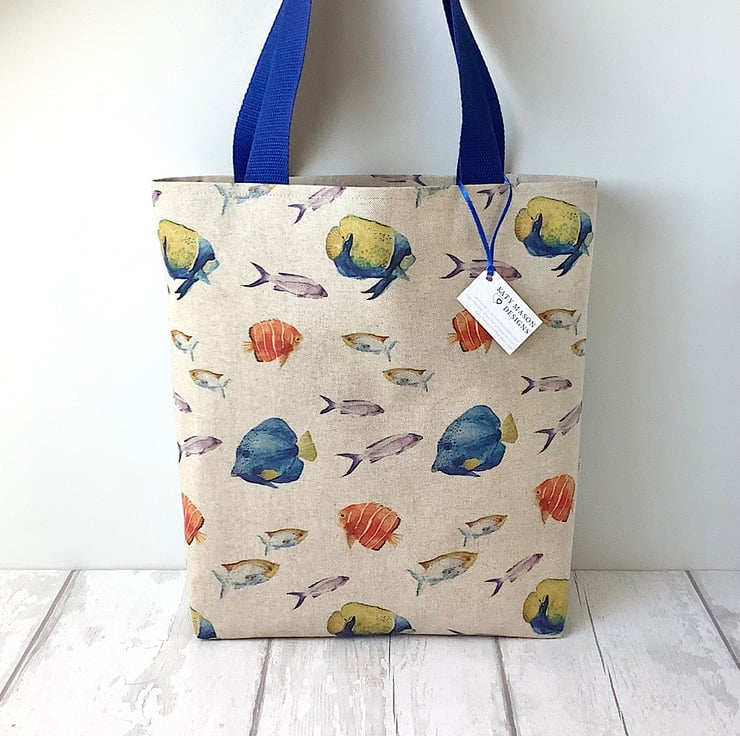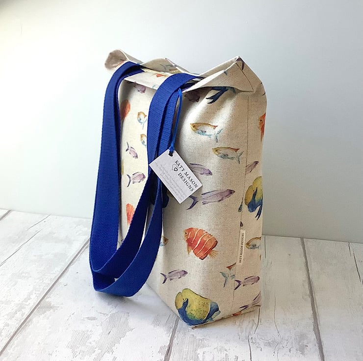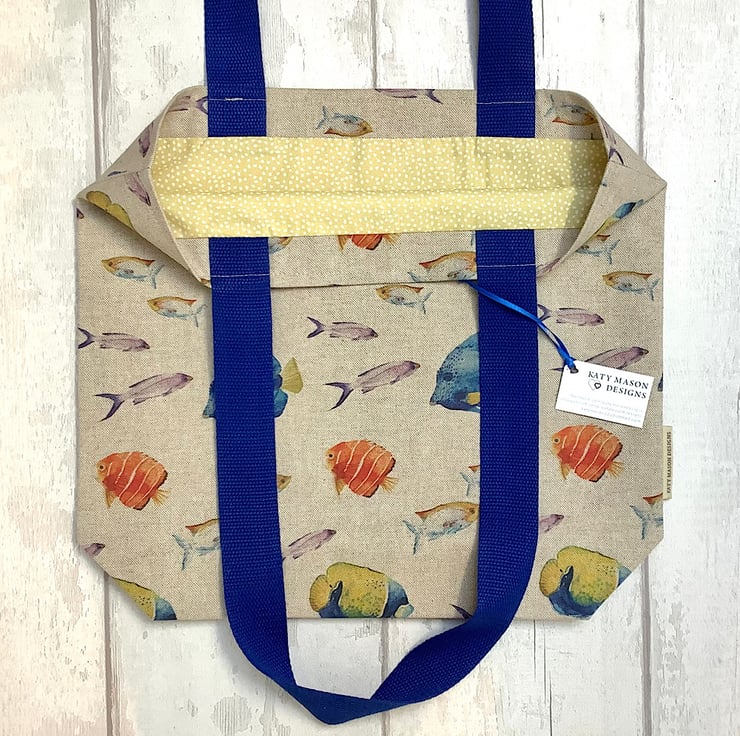 Colourful fish print tote bag with long handles and lined in yellow spot with an inside pocket. Perfect for holidays, day trips, craft or book bag. Can be folded flat to travelling. 38cm H, 35cm W, 12cm D.