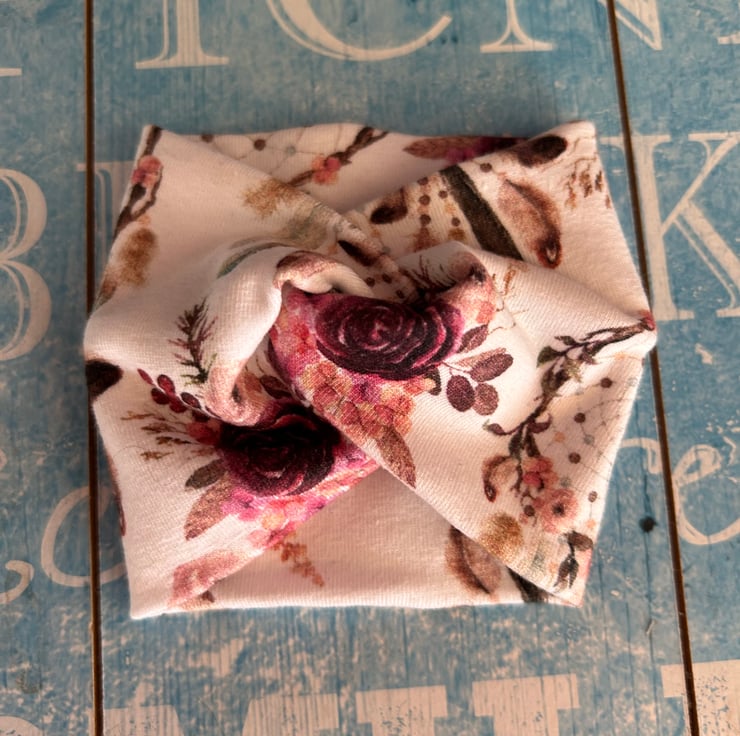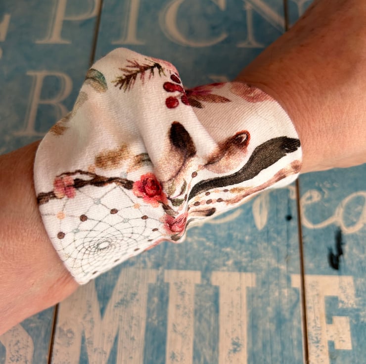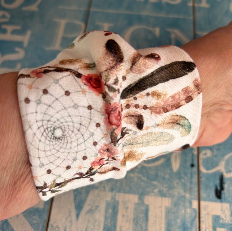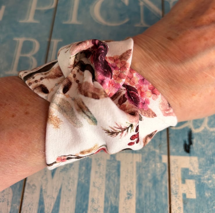 Cuff bracelet in Dream catcher printed fabric, a wrap twist style bracelet in dusky pink shades.