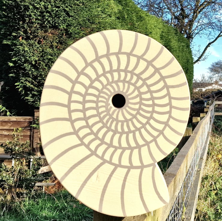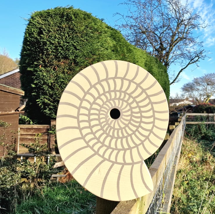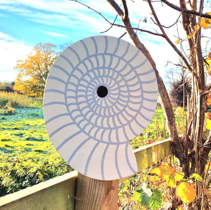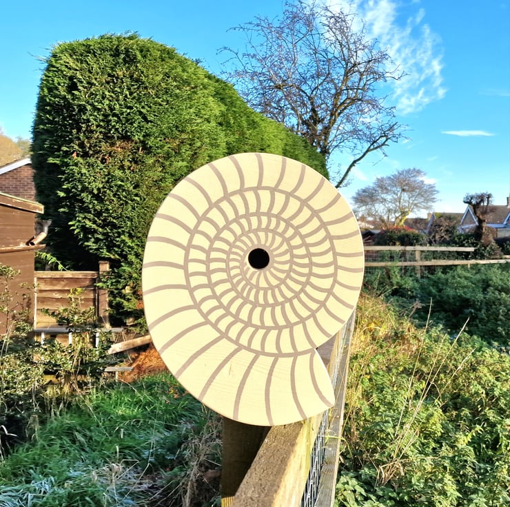 The ammonite bird box is carefully handmade, by us here at Lindleywood, from high-grade sustainable European redwood pine supplied by a small local woodmerchant. It is then handpainted with water-based wood paints suitable for exterior use. These paints, by Little Greene, a very small independent British manufacturer from the northwest of England (who have been creating paints since 1773), enable us to create beautiful products that are non-toxic to plants and wildlife.