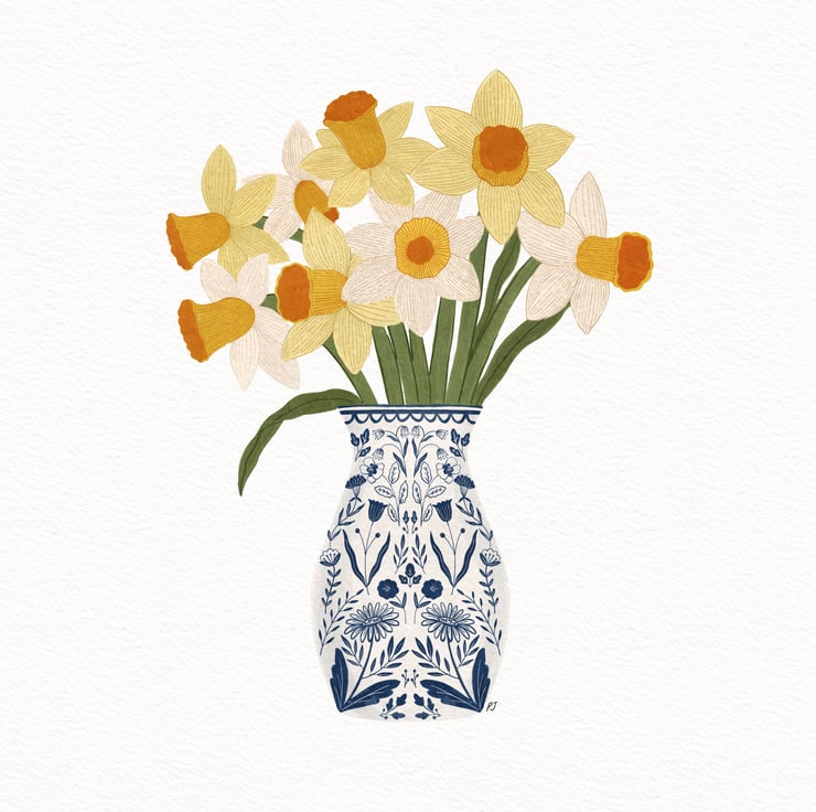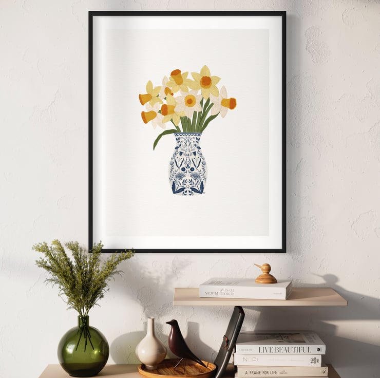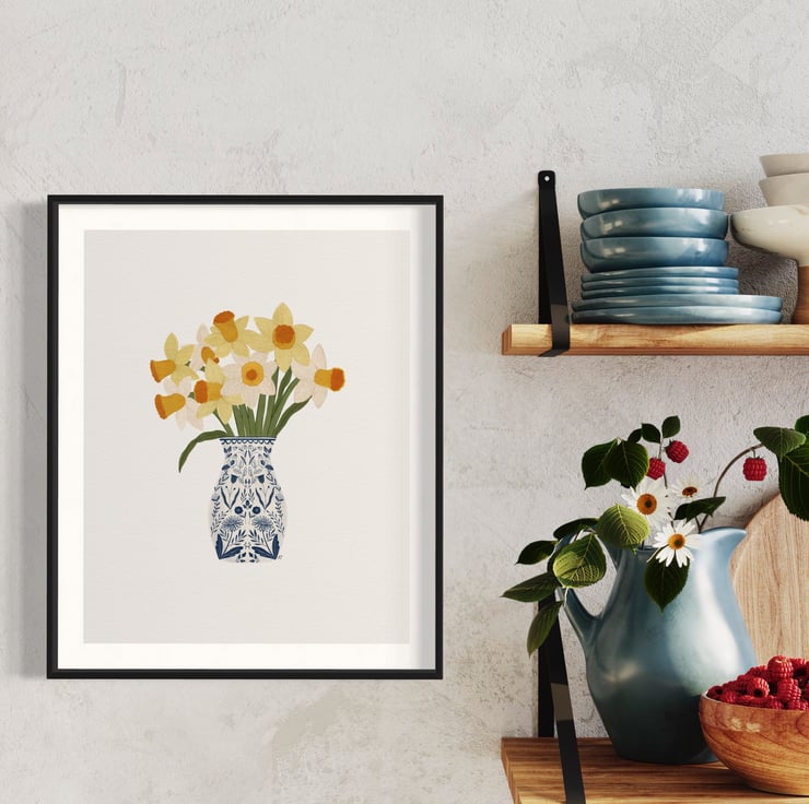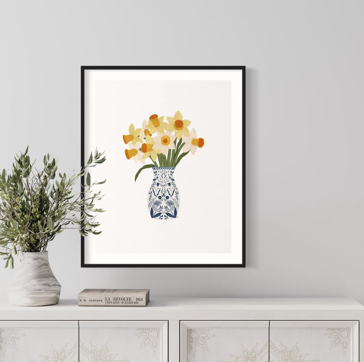 This stunning A4 gouache art print on archival matte paper showcases a gorgeous porcelain vase with beautiful daffodils , perfect for any lover of Floral illustration art prints.