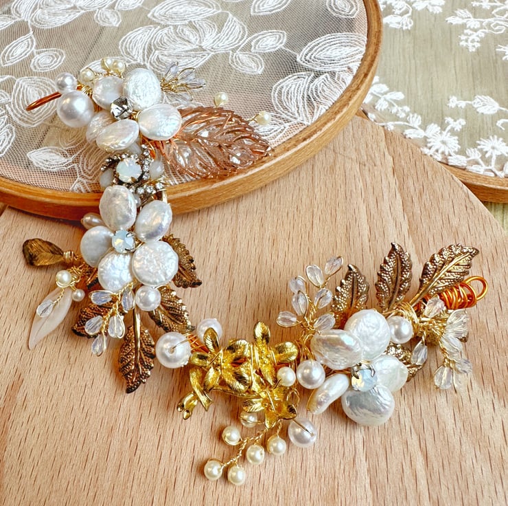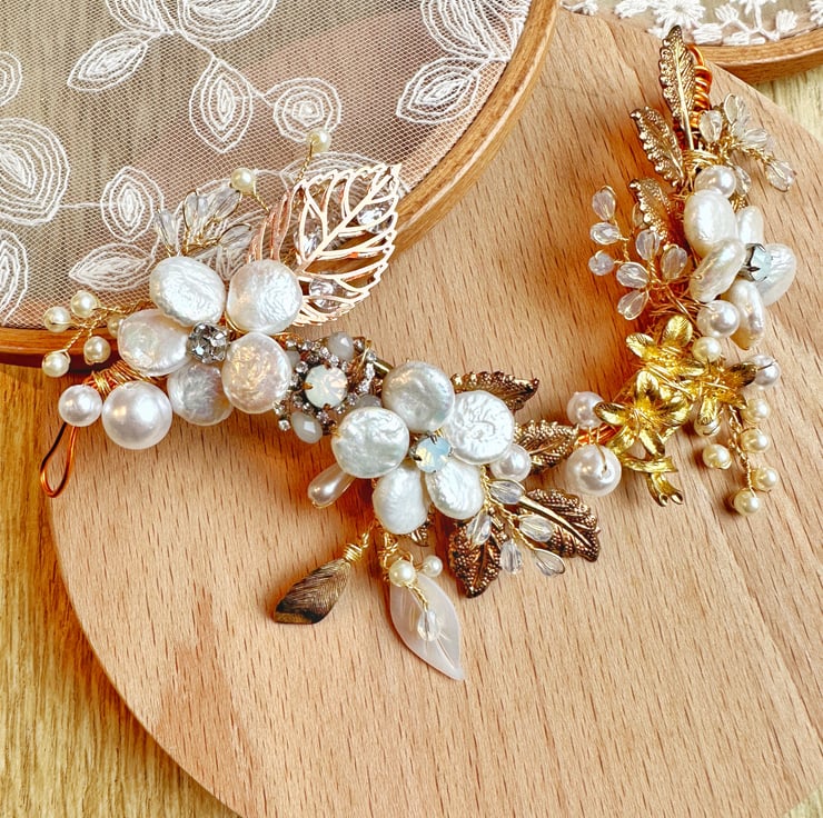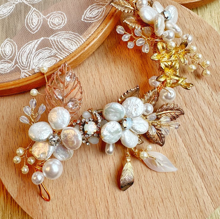 - Created with gold metal leaf and flower, baroque natural pearl, glass beads, Swarovski