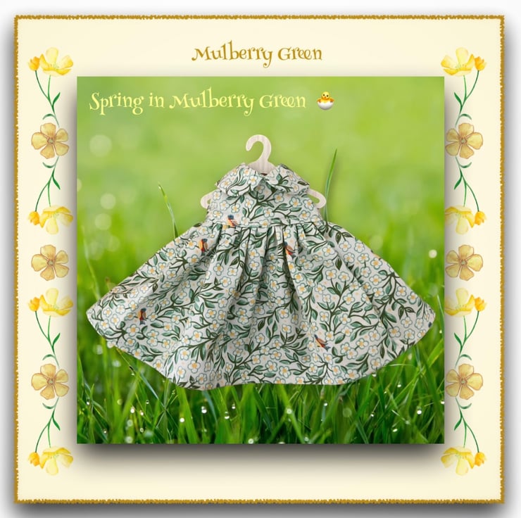 A lovely little Springtime dress in a little birds print edged with gold, to fit the Mulberry Green characters. The dress is made from best quality cotton, has a full skirt and a lined bodice.