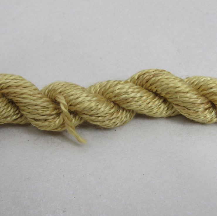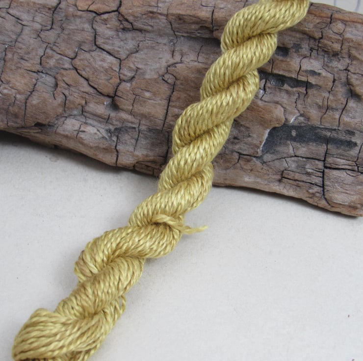Hand dyed pure silk embroidery thread, dyed with St John's Wort gathered from my garden to give a gentle light green-gold