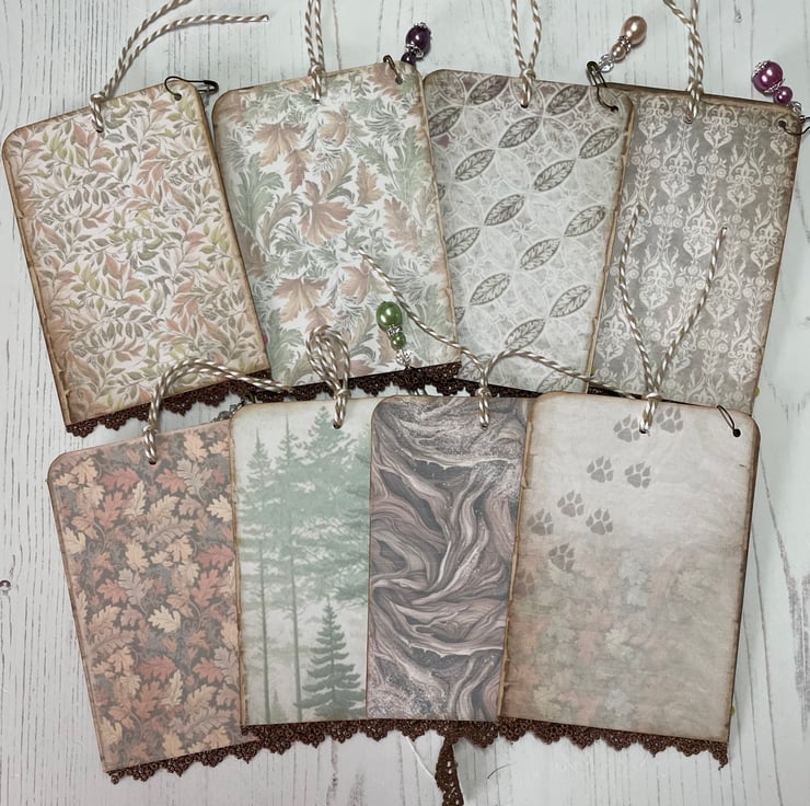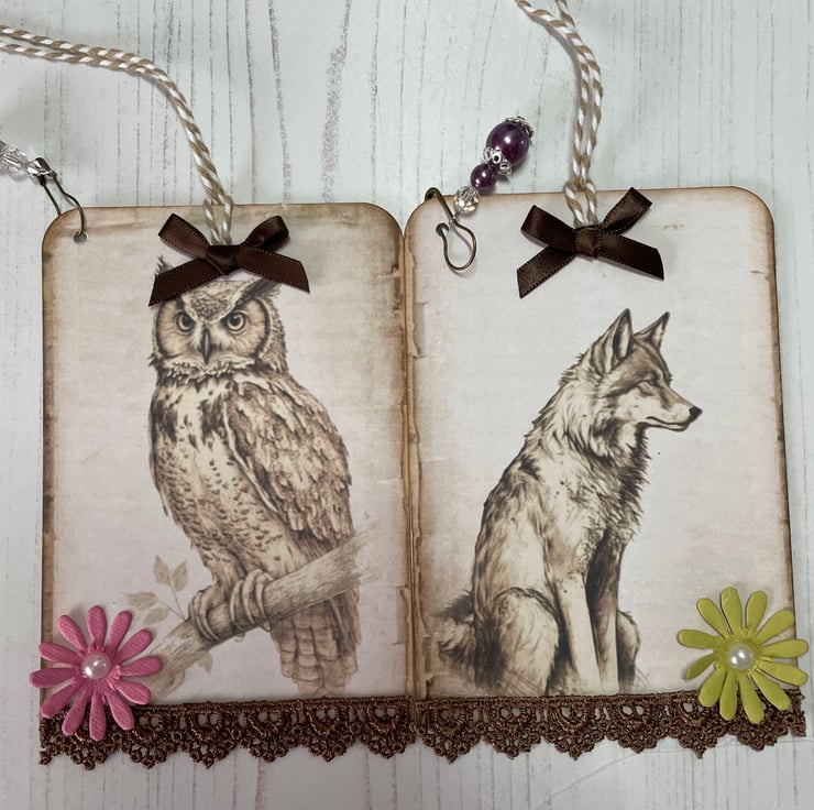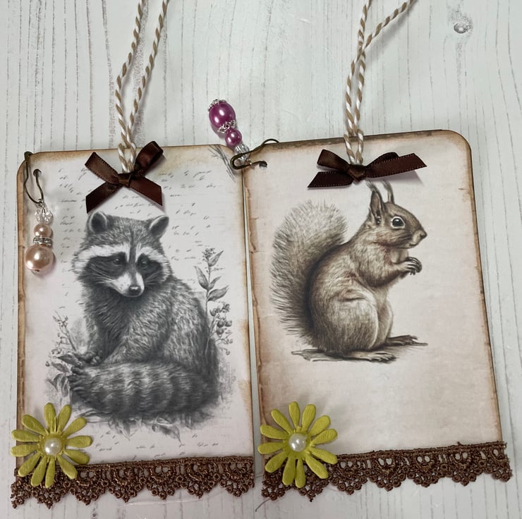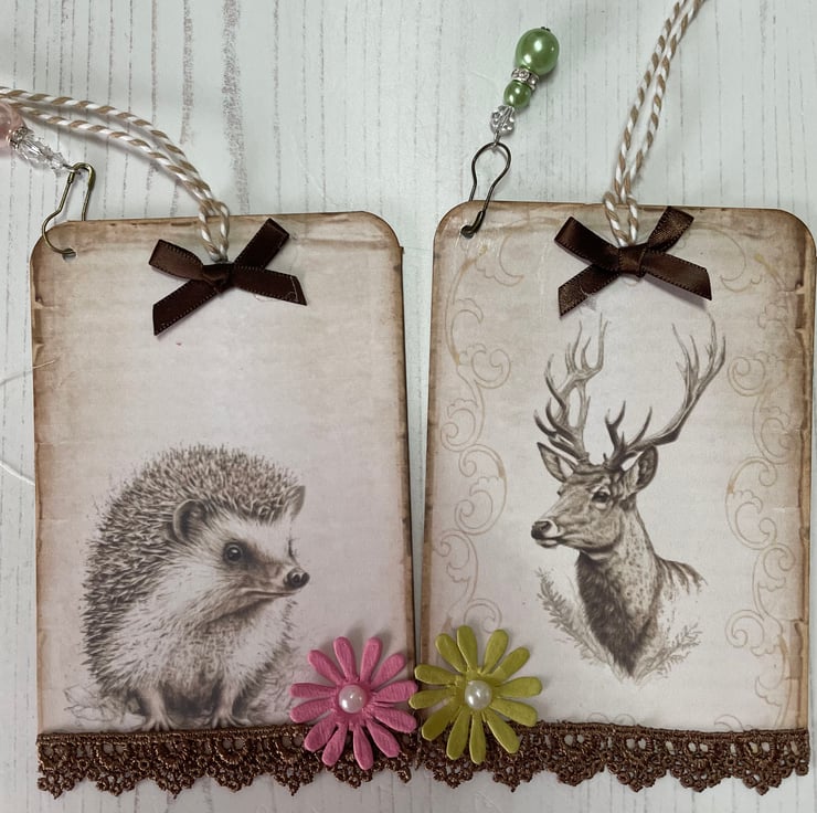 Set of 8 tags depicting beautiful woodland creatures. Each backed with a complimenting pattern. Edged with dark brown guipure lace. Topped with a daisy with a pearl centre. Bulb pin with pearls and crystals to decorate. Finished off with a brown ribbon bow and bakers twine for tying. Measure 4.75” x 3.25”.